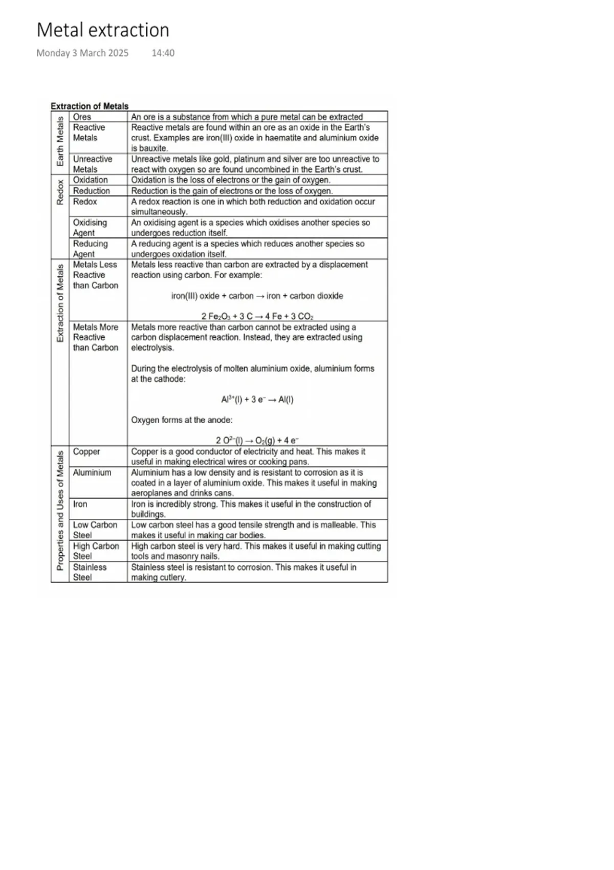 Summary Notes for Metal Extraction Chemistry iGCSE Pearson Edexcel
