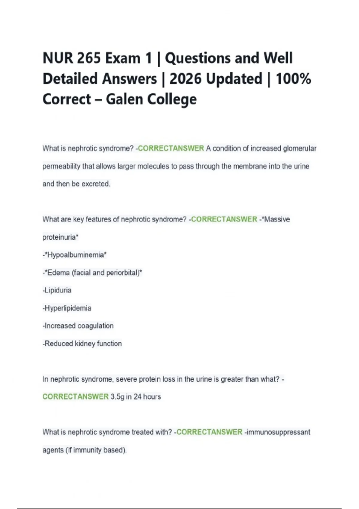 NUR 265 Exam 1 | Questions and Well Detailed Answers | 2026 Updated | 100% Correct - Galen College