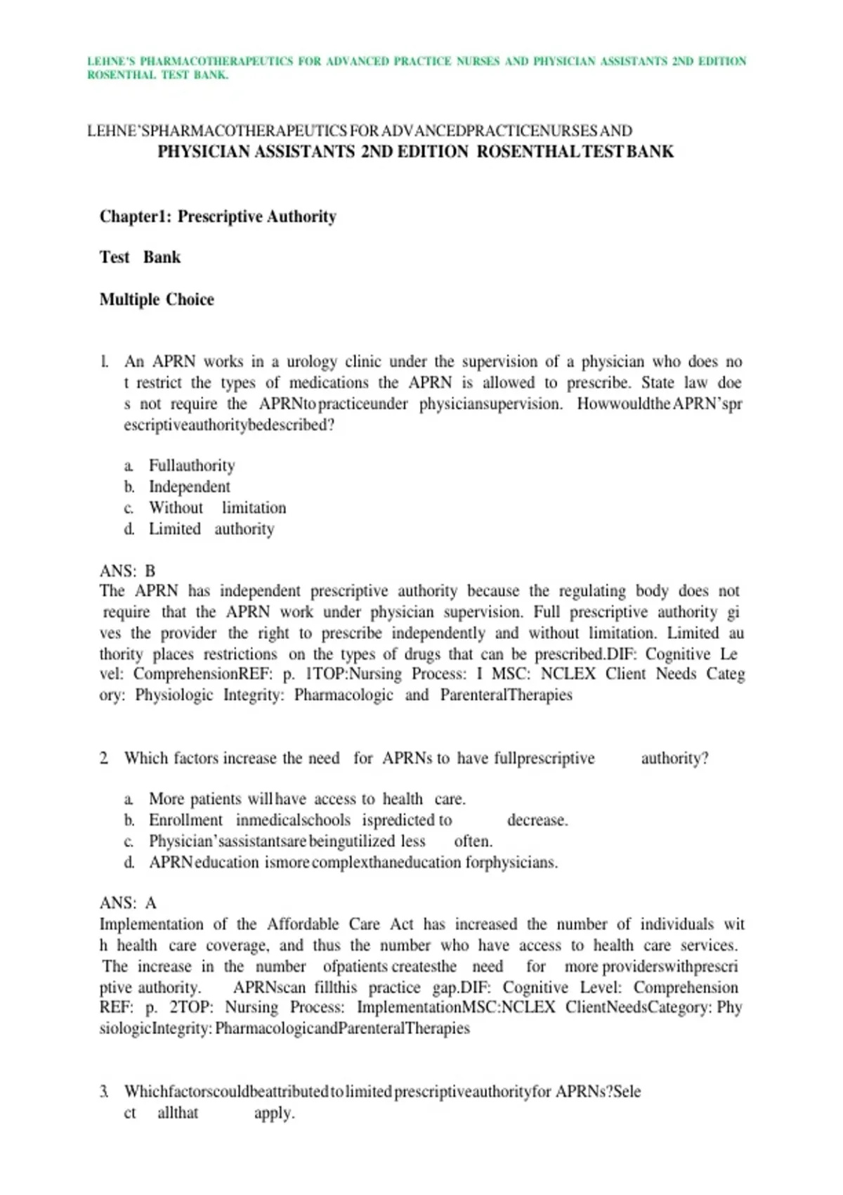 This Updated 2025–2026 Test Bank for Lehne’s Pharmacotherapeutics for Advanced Practice Nurses and Physician Assistants, 2nd Edition is an indispensable study and teaching aid tailored specifically for advanced practice nursing and physician assistant programs. Based on the authoritative textbook authored by Laura D. Rosenthal and Jacqueline Rosenjack Burchum, this comprehensive test bank aligns with the second edition’s chapters and learning goals to provide accurate, relevant, and classroom-ready assessment material. Inside, you’ll find a wide variety of question types—including multiple choice, true/false, short answer, and clinical scenario questions—that reflect the real-world challenges students encounter in pharmacotherapeutics and prescribing practices. These questions cover core content areas such as pharmacokinetics, pharmacodynamics, prescription writing, rational drug selection, and safe drug therapy decision-making. The updated content ensures students and educators can focus study and instructional time on the most critical and current aspects of advanced pharmacology practice. By using this test bank, instructors can create high-quality exams and quizzes with confidence, and students gain a structured means of self-evaluation to improve mastery of essential pharmacotherapeutic concepts and clinical reasoning skills.