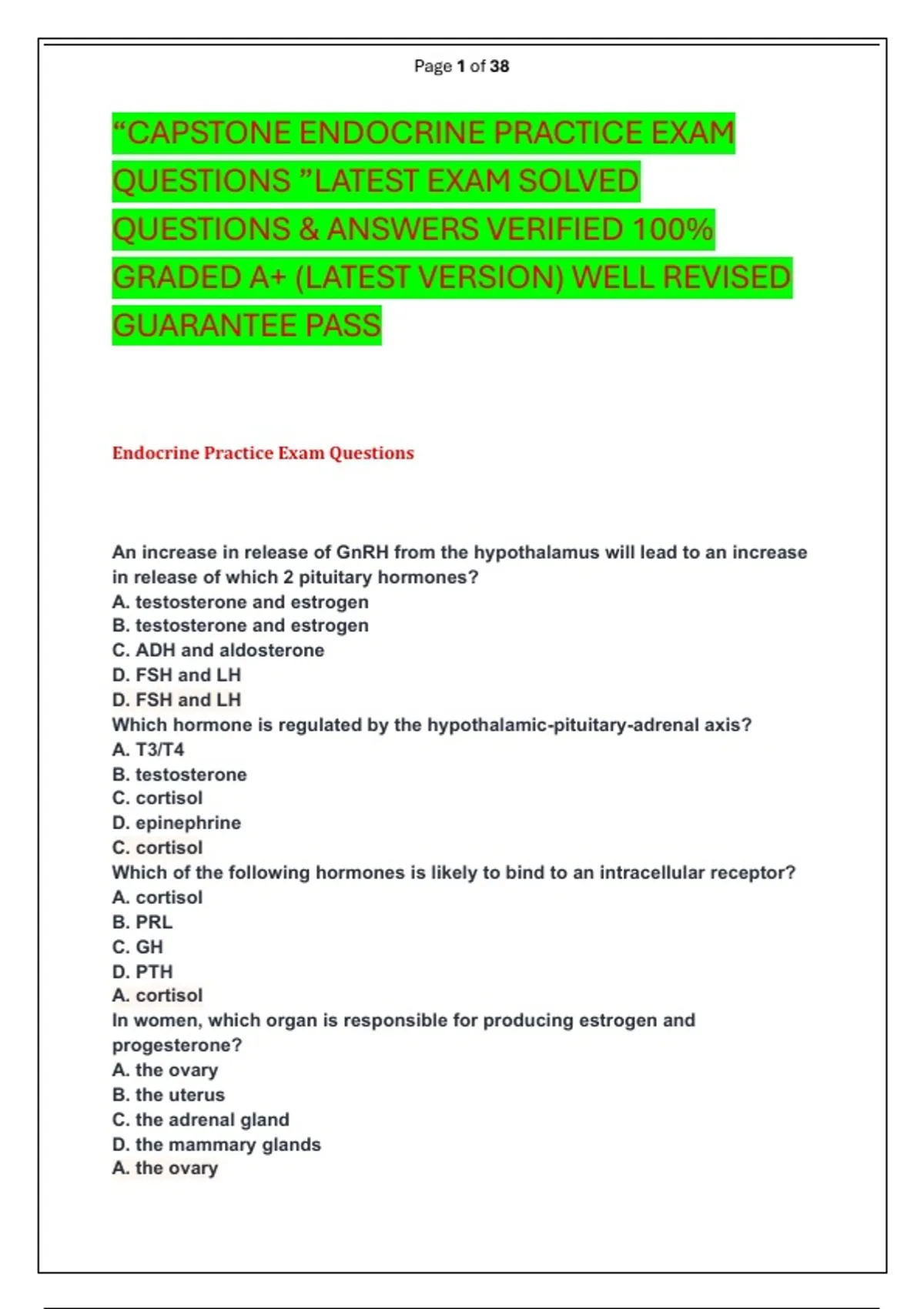 “CAPSTONE ENDOCRINE PRACTICE EXAM QUESTIONS ”LATEST EXAM SOLVED QUESTIONS & ANSWERS VERIFIED 100% GRADED A+ (LATEST VERSION) WELL REVISED GUARANTEE PASS