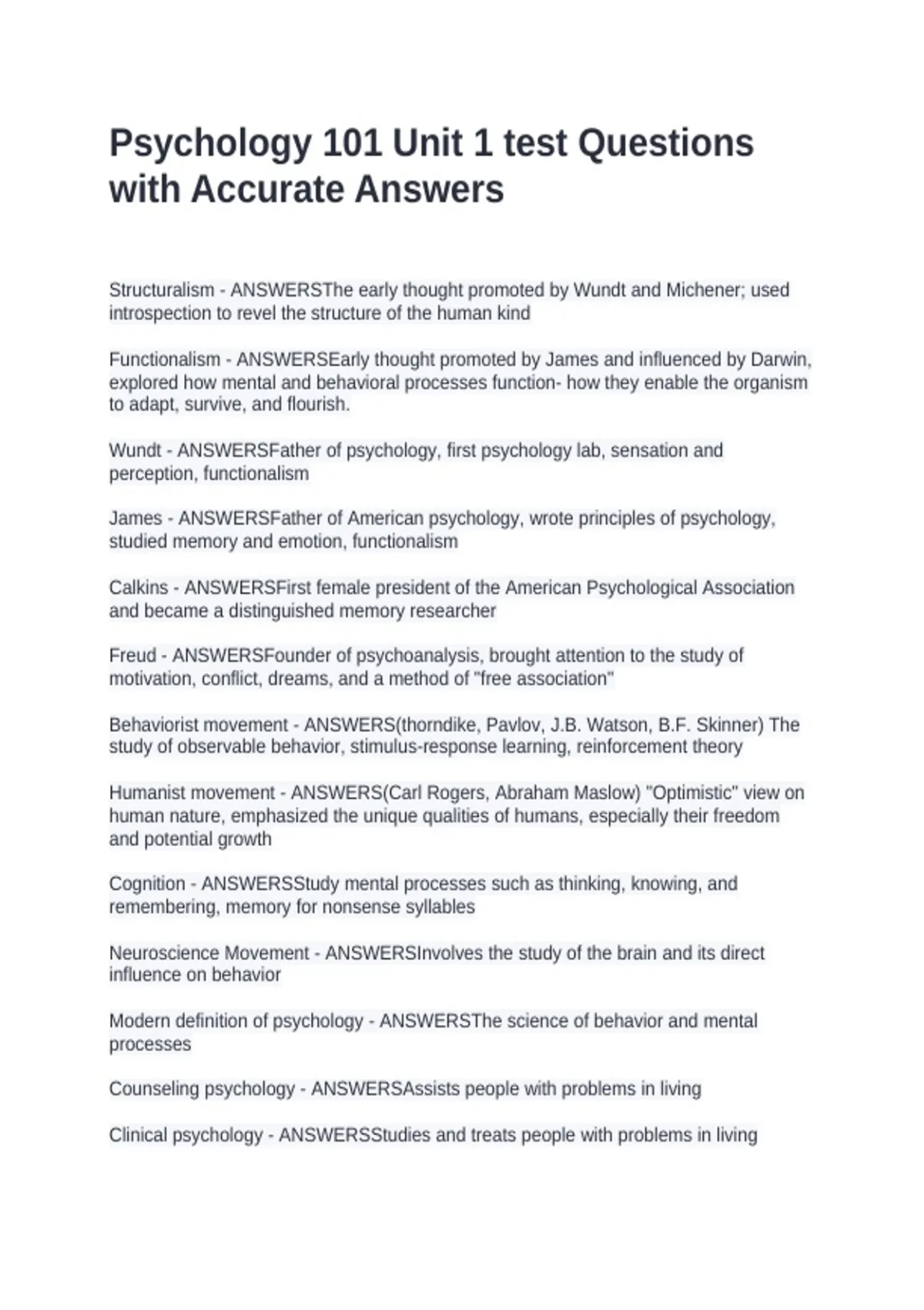 Structuralism - ANSWERSThe early thought promoted by Wundt and Michener; used introspection to revel the structure of the human kind Functionalism - ANSWERSEarly thought promoted by James and influenced by Darwin, explored how mental and behavioral processes function- how they enable the organism to adapt, survive, and flourish. Wundt - ANSWERSFather of psychology, first psychology lab, sensation and perception, functionalism James - ANSWERSFather of American psychology, wrote principles of psychology, studied memory and emotion, functionalism Calkins - ANSWERSFirst female president of the American Psychological Association and became a distinguished memory researcher Freud - ANSWERSFounder of psychoanalysis, brought attention to the study of motivation, conflict, dreams, and a method of "free association" Behaviorist movement - ANSWERS(thorndike, Pavlov, J.B. Watson, B.F. Skinner) The study of observable behavior, stimulus-response learning, reinforcement theory Humanist movement - ANSWERS(Carl Rogers, Abraham Maslow) "Optimistic" view on human nature, emphasized the unique qualities of humans, especially their freedom and potential growth Cognition - ANSWERSStudy mental processes such as thinking, knowing, and remembering, memory for nonsense syllables Neuroscience Movement - ANSWERSInvolves the study of the brain and its direct influence on behavior Modern definition of psychology - ANSWERSThe science of behavior and mental processes Counseling psychology - ANSWERSAssists people with problems in living Clinical psychology - ANSWERSStudies and treats people with problems in living