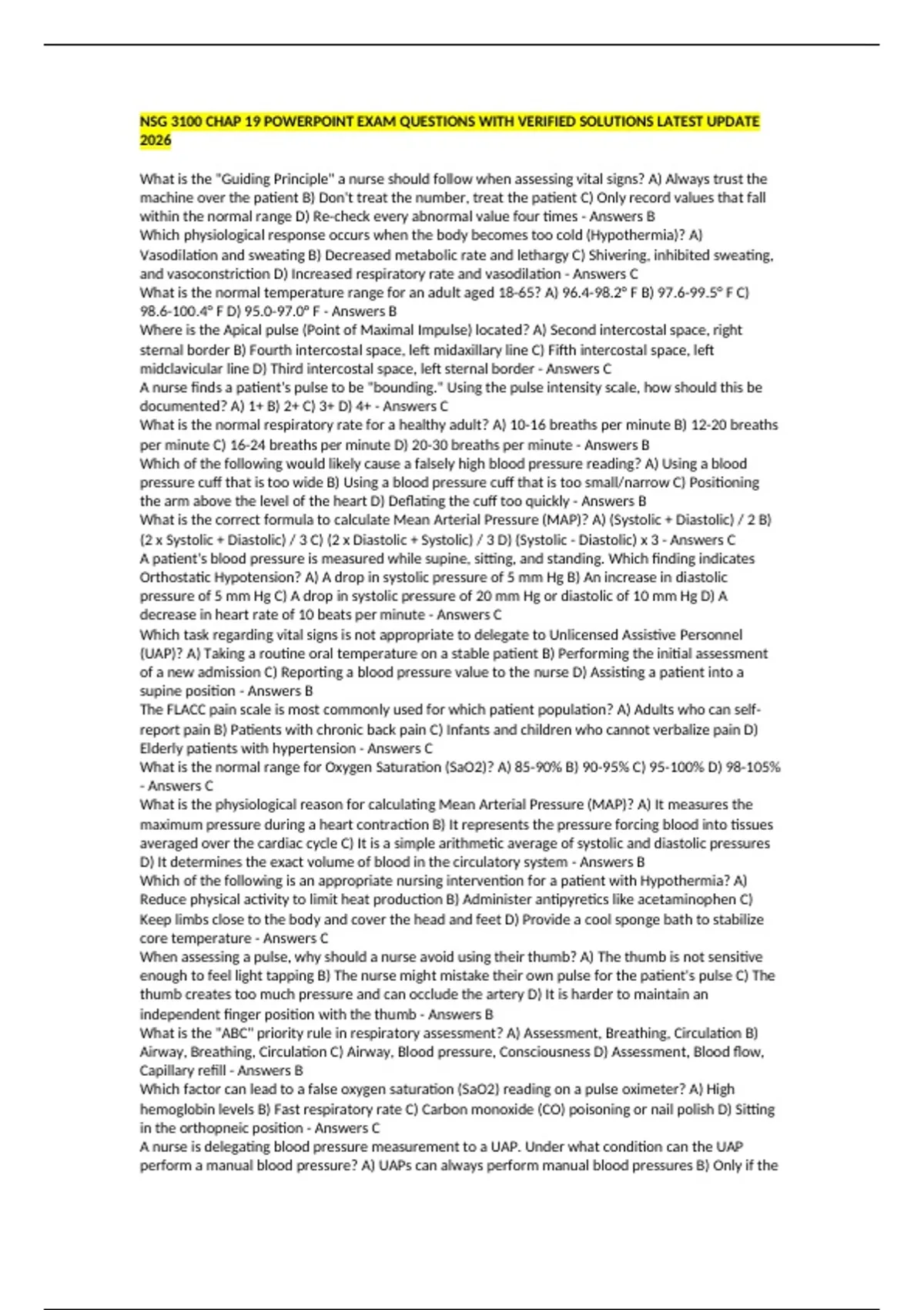NSG 3100 CHAP 19 POWERPOINT EXAM QUESTIONS WITH VERIFIED SOLUTIONS LATEST UPDATE 2026 What is the "Guiding Principle" a nurse should follow when assessing vital signs? A) Always trust the machine over the patient B) Don't treat the number, treat the patient C) Only record values that fall within the normal range D) Re-check every abnormal value four times - Answers B Which physiological response occurs when the body becomes too cold (Hypothermia)? A) Vasodilation and sweating B) Decreased metabolic rate and lethargy C) Shivering, inhibited sweating, and vasoconstriction D) Increased respiratory rate and vasodilation - Answers C What is the normal temperature range for an adult aged 18-65? A) 96.4-98.2° F B) 97.6-99.5° F C) 98.6-100.4° F D) 95.0-97.0° F - Answers B Where is the Apical pulse (Point of Maximal Impulse) located? A) Second intercostal space, right sternal border B) Fourth intercostal space, left midaxillary line C) Fifth intercostal space, left midclavicular line D) Third intercostal space, left sternal border - Answers C A nurse finds a patient's pulse to be "bounding." Using the pulse intensity scale, how should this be documented? A) 1+ B) 2+ C) 3+ D) 4+ - Answers C What is the normal respiratory rate for a healthy adult? A) 10-16 breaths per minute B) 12-20 breaths per minute C) 16-24 breaths per minute D) 20-30 breaths per minute - Answers B Which of the following would likely cause a falsely high blood pressure reading? A) Using a blood pressure cuff that is too wide B) Using a blood pressure cuff that is too small/narrow C) Positioning the arm above the level of the heart D) Deflating the cuff too quickly - Answers B What is the correct formula to calculate Mean Arterial Pressure (MAP)? A) (Systolic + Diastolic) / 2 B) (2 x Systolic + Diastolic) / 3 C) (2 x Diastolic + Systolic) / 3 D) (Systolic - Diastolic) x 3 - Answers C A patient's blood pressure is measured while supine, sitting, and standing. Which finding indicates Orthostatic Hypotension? A) A drop in systolic pressure of 5 mm Hg B) An increase in diastolic pressure of 5 mm Hg C) A drop in systolic pressure of 20 mm Hg or diastolic of 10 mm Hg D) A decrease in heart rate of 10 beats per minute - Answers C Which task regarding vital signs is not appropriate to delegate to Unlicensed Assistive Personnel (UAP)? A) Taking a routine oral temperature on a stable patient B) Performing the initial assessment of a new admission C) Reporting a blood pressure value to the nurse D) Assisting a patient into a supine position - Answers B The FLACC pain scale is most commonly used for which patient population? A) Adults who can self-report pain B) Patients with chronic back pain C) Infants and children who cannot verbalize pain D) Elderly patients with hypertension - Answers C What is the normal range for Oxygen Saturation (SaO2)? A) 85-90% B) 90-95% C) 95-100% D) 98-105% - Answers C What is the physiological reason for calculating Mean Arterial Pressure (MAP)? A) It measures the maximum pressure during a heart contraction B) It represents the pressure forcing blood into tissues averaged over the cardiac cycle C) It is a simple arithmetic average of systolic and diastolic pressures D) It determines the exact volume of blood in the circulatory system - Answers B Which of the following is an appropriate nursing intervention for a patient with Hypothermia? A) Reduce physical activity to limit heat production B) Administer antipyretics like acetaminophen C) Keep limbs close to the body and cover the head and feet D) Provide a cool sponge bath to stabilize core temperature - Answers C When assessing a pulse, why should a nurse avoid using their thumb? A) The thumb is not sensitive enough to feel light tapping B) The nurse might mistake their own pulse for the patient's pulse C) The thumb creates too much pressure and can occlude the artery D) It is harder to maintain an independent finger position with the thumb - Answers B What is the "ABC" priority rule in respiratory assessment? A) Assessment, Breathing, Circulation B) Airway, Breathing, Circulation C) Airway, Blood pressure, Consciousness D) Assessment, Blood flow, Capillary refill - Answers B Which factor can lead to a false oxygen saturation (SaO2) reading on a pulse oximeter? A) High hemoglobin levels B) Fast respiratory rate C) Carbon monoxide (CO) poisoning or nail polish D) Sitting in the orthopneic position - Answers C