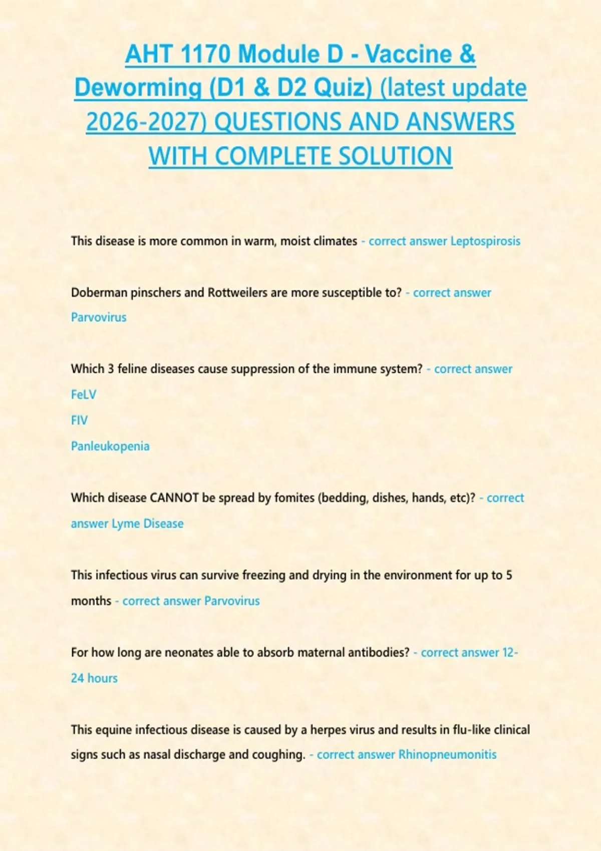 AHT 1170 Module D - Vaccine & Deworming (D1 & D2 Quiz) (latest update ) QUESTIONS AND ANSWERS