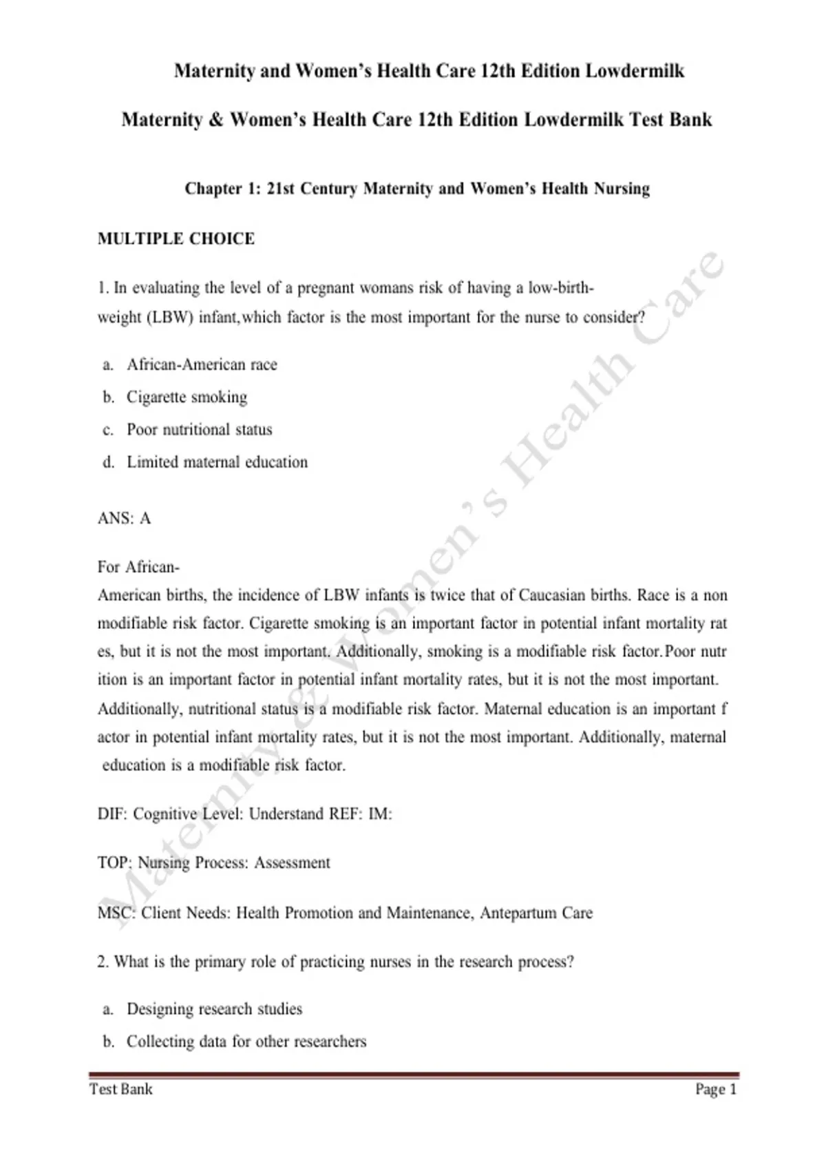Maternity & Women’s Health Care 12th Edition Lowdermilk Test Bank