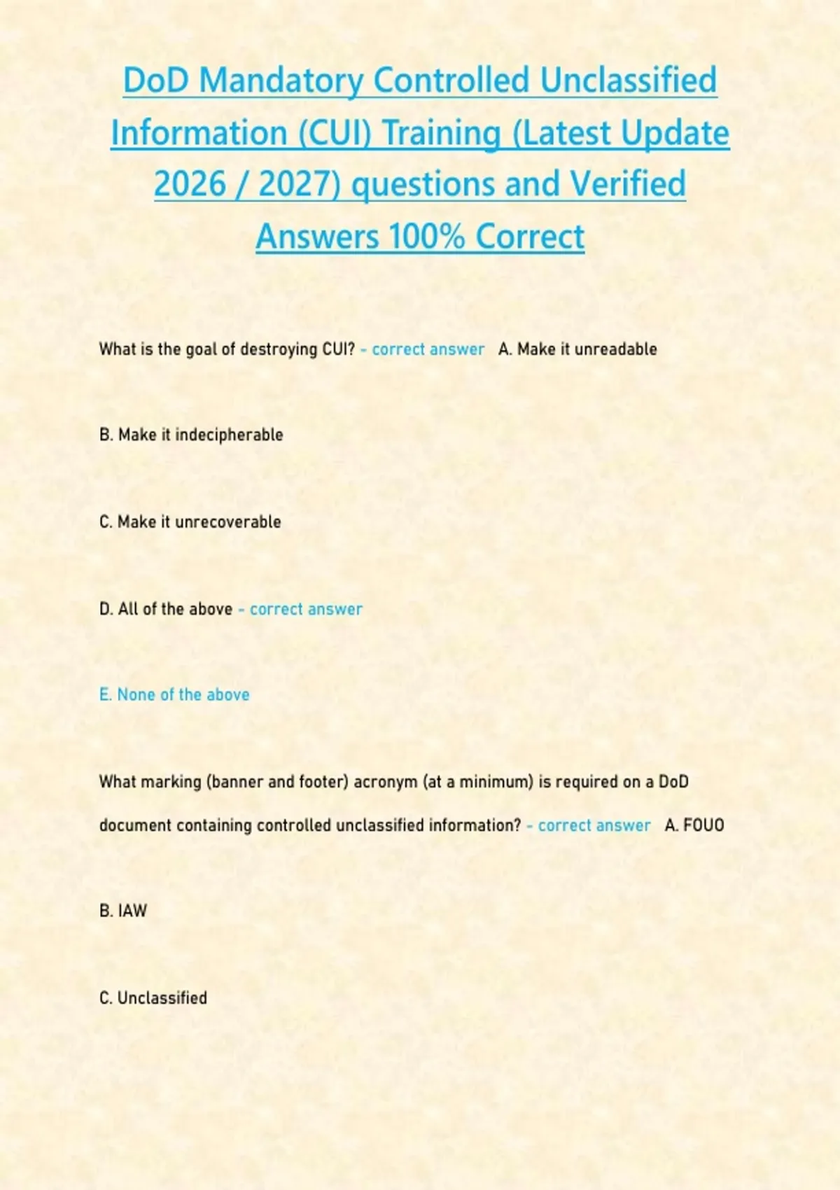 DoD Mandatory Controlled Unclassified Information (CUI) Training (Latest Update ) questions AND ANSWERS