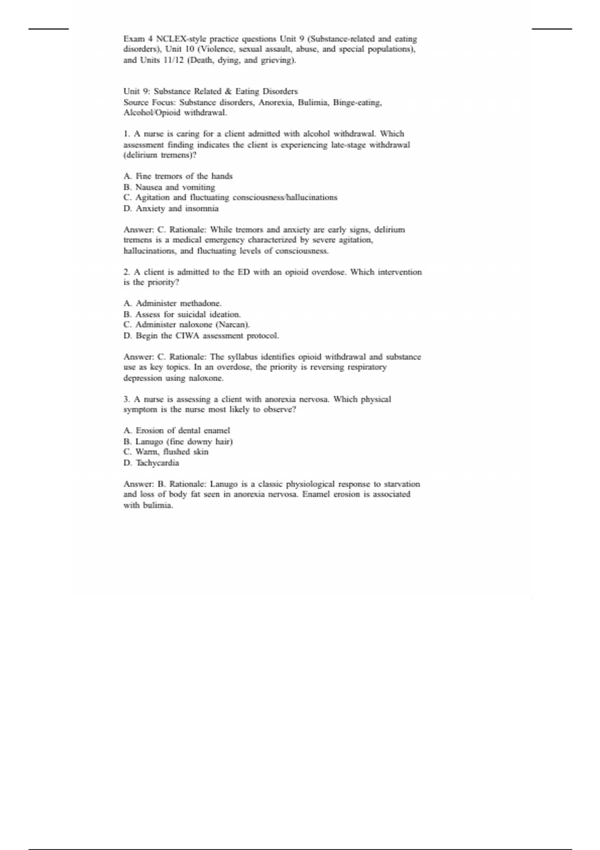 Exam 4 NCLEX-style practice questions Unit 9 (Substance-related and eating