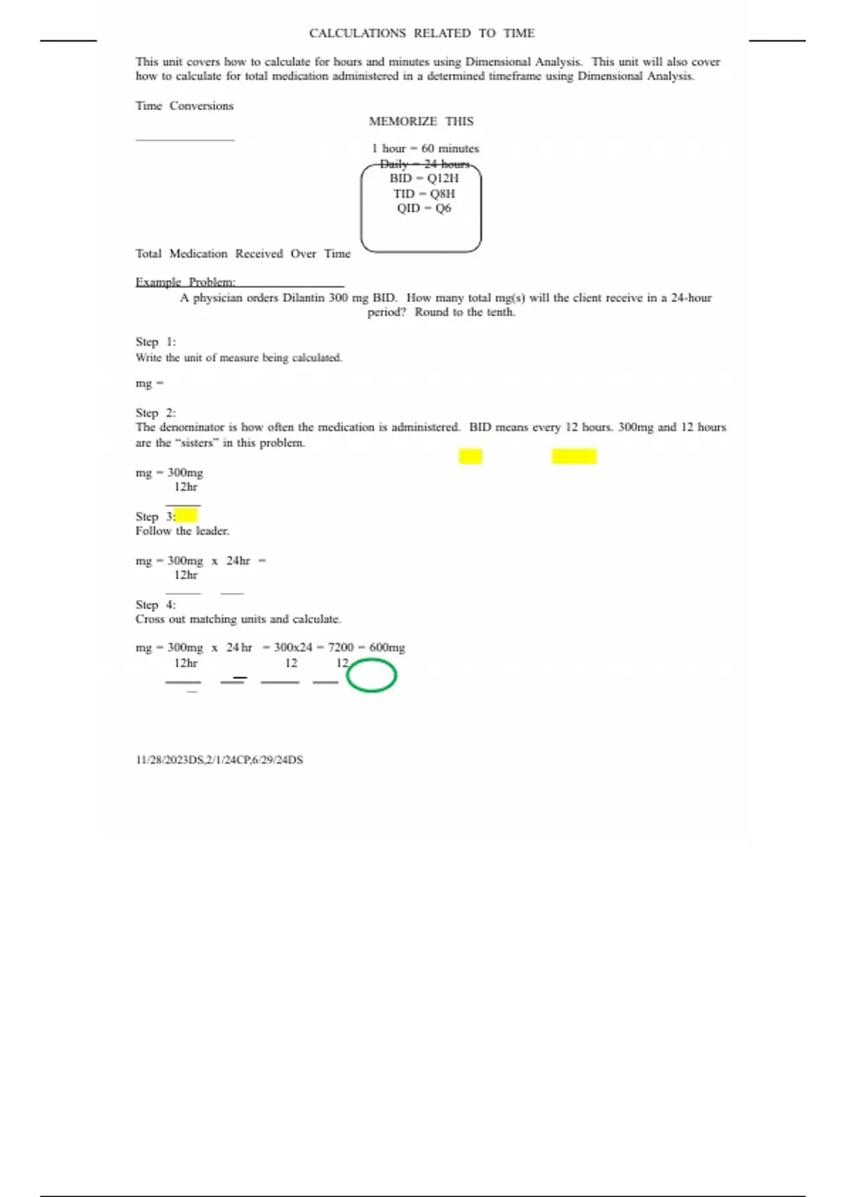 CALCULATION OF TIME & MEDICATION DOSAGE (DS, CP, DS)