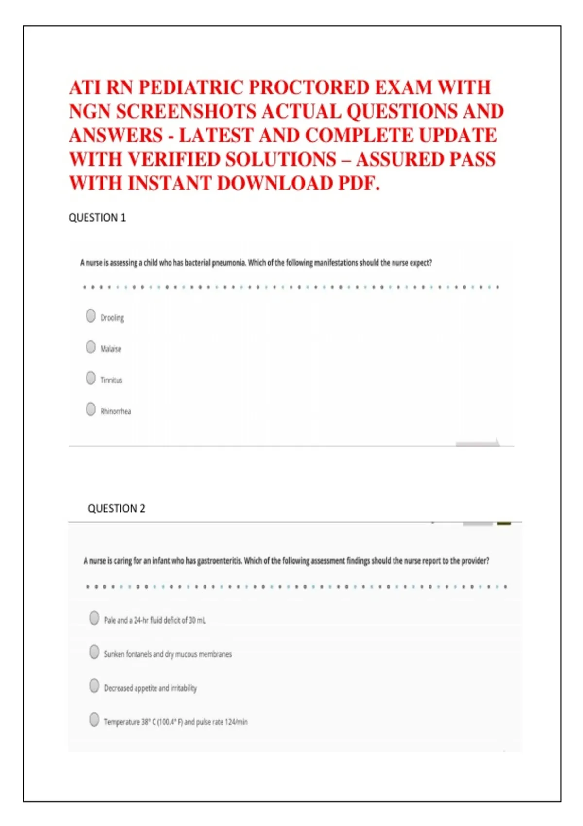 ATI RN PEDIATRIC PROCTORED EXAM WITH NGN SCREENSHOTS ACTUAL QUESTIONS AND ANSWERS - LATEST AND COMPLETE UPDATE WITH VERIFIED SOLUTIONS – ASSURED PASS WITH INSTANT DOWNLOAD PDF.