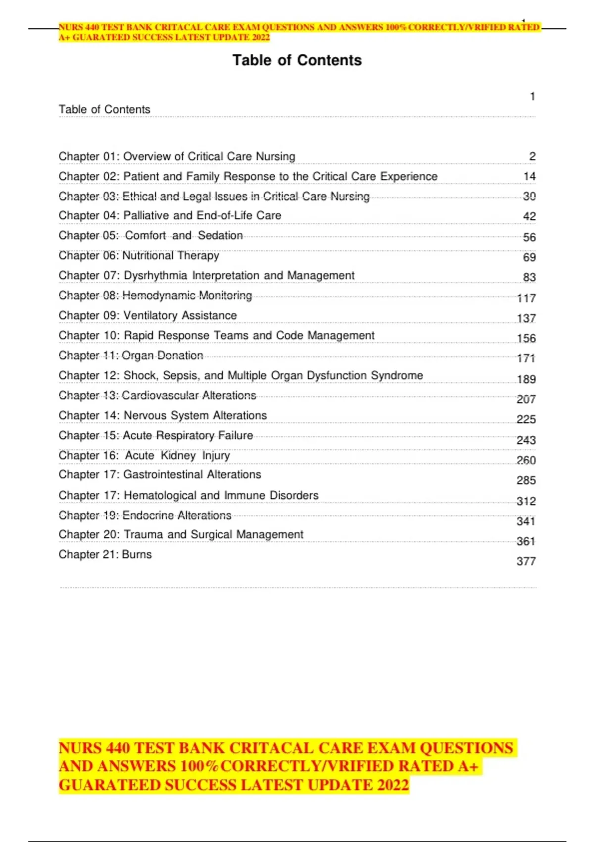 NURS 440 TEST BANK CRITACAL CARE EXAM QUESTIONS
