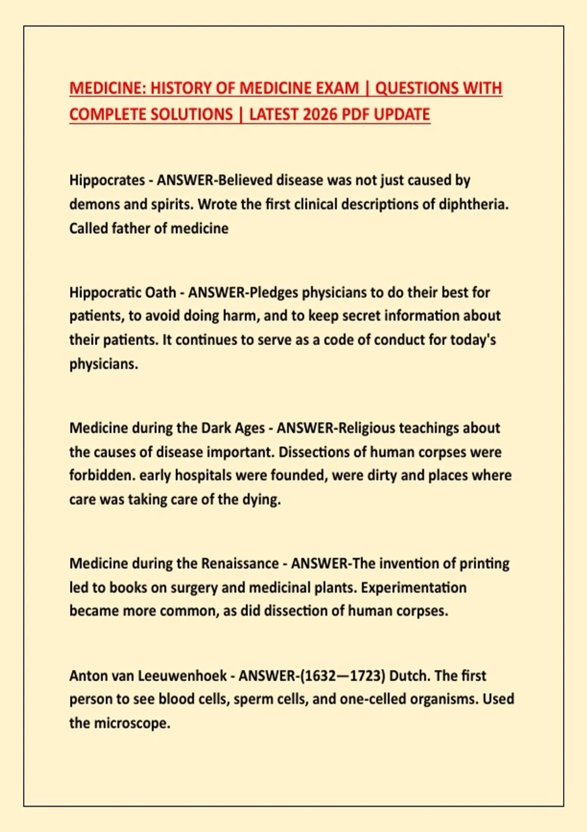 MEDICINE: HISTORY OF MEDICINE EXAM | QUESTIONS WITH COMPLETE SOLUTIONS | LATEST 2026 PDF UPDATE