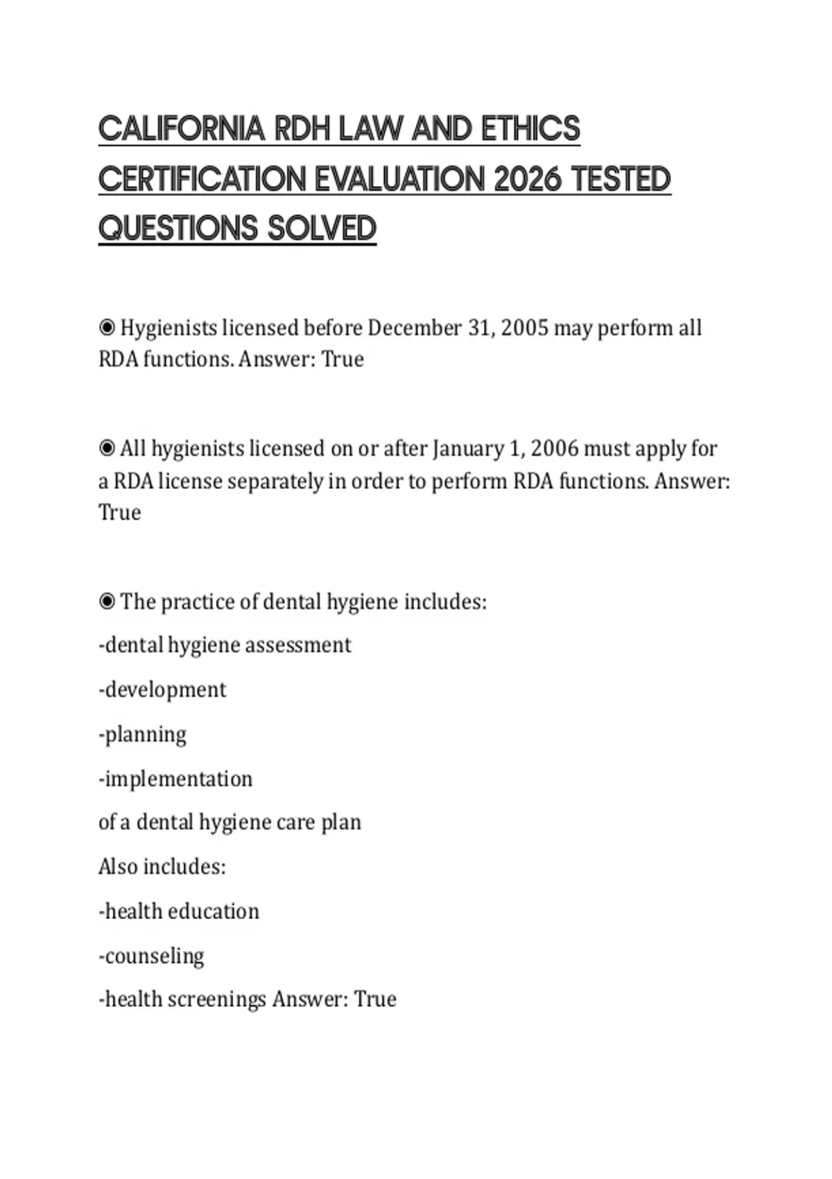 CALIFORNIA RDH LAW AND ETHICS CERTIFICATION EVALUATION 2026 TESTED QUESTIONS SOLVED