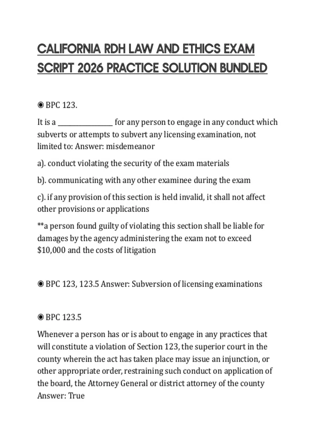 ◉ BPC 123, 123.5 Answer: Subversion of licensing examinations
