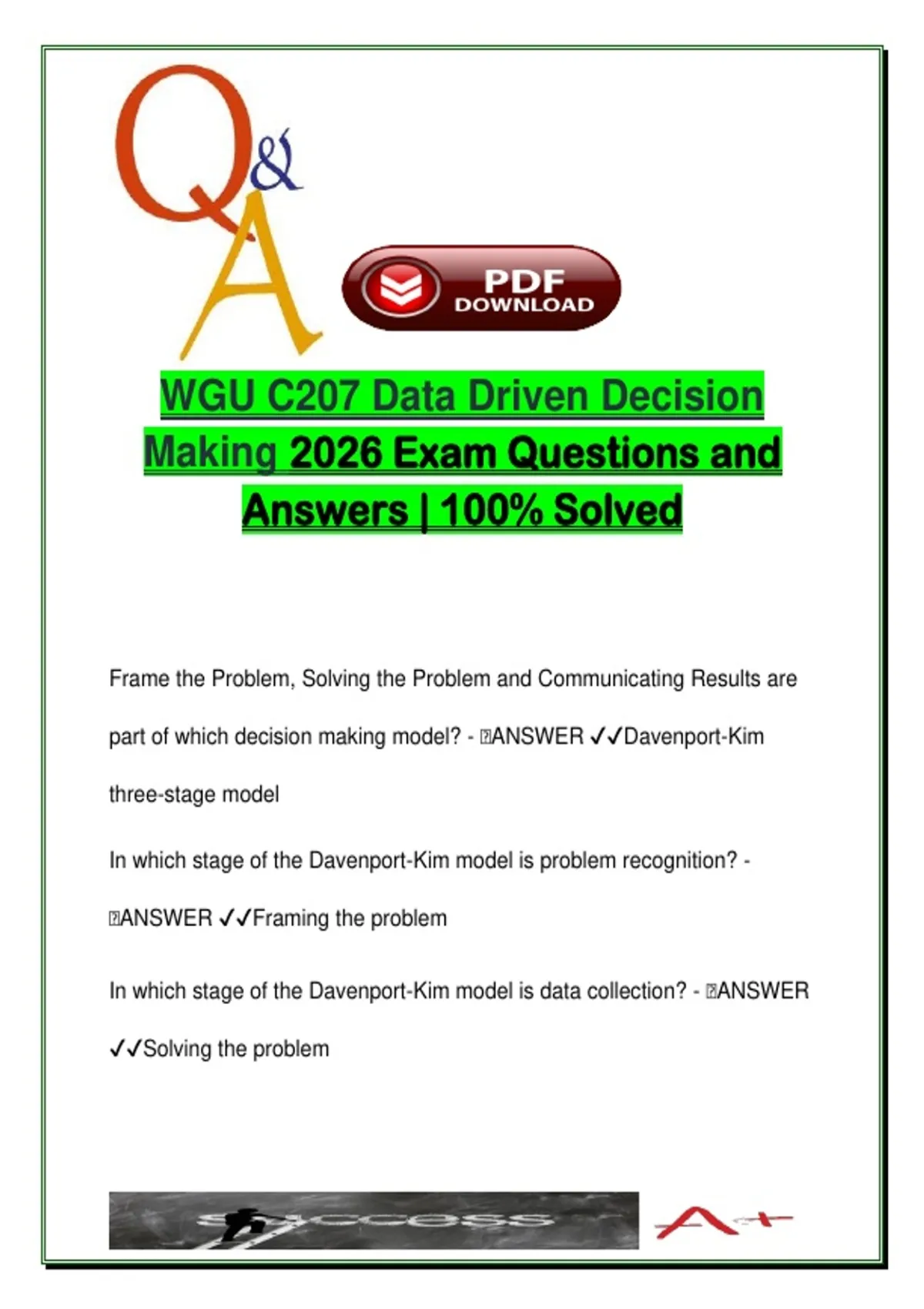 This comprehensive and expertly verified resource contains over 100 real exam questions and accurate answers for the 2026 WGU C207 Data-Driven Decision Making course. Designed specifically for students at Western Governors University, it equips learners with the statistical reasoning and data literacy required to excel in data-informed decision-making across business, healthcare, and government sectors. The material covers the full range of C207 objectives, including the Davenport-Kim model, research validity and reliability, bias types, descriptive and inferential analytics, Big Data concepts, hypothesis testing, and regression analysis. The exam questions are structured in a clear Q&A format, making this a practical and effective tool for exam review, final assessments, and practical application. Major topics and tools covered include: Decision-making frameworks: Davenport-Kim model, PDCA, Lean, Six Sigma, SIPOC, Balanced Scorecard Statistical foundations: Mean, median, mode, standard deviation, z-scores, bell curve, data distribution Measurement & data quality: Validity, reliability, random/systematic error, measurement bias, response bias Analytical methods: Descriptive, predictive, and prescriptive analytics; t-tests, ANOVA, Chi-square, regression Probability & distribution: Sample size, random sampling, conditional probability, Bayes Theorem, combinations Data visualization & correlation: Histograms, scatter diagrams, correlation coefficients, R-squared analysis Quality management tools: Control charts, flowcharts, cause-and-effect diagrams, Pareto charts, run charts Performance evaluation: KPIs, dashboards, cost-benefit analysis, Results-Based Management (RBM), IRT This document is ideal for WGU students preparing for the C207 Objective Assessment (OA) and anyone needing practical knowledge of data-informed problem-solving and quality assessment. Best suited for: WGU students enrolled in C207 – Data-Driven Decision Making Business, healthcare, public administration, and data analytics majors Professionals preparing for roles involving quantitative decision-making Learners seeking structured preparation for statistics and analytics exams Keywords: WGU C207, data-driven decision-making, Davenport-Kim model, descriptive analytics, predictive analytics, prescriptive analytics, z-score, hypothesis testing, PDCA cycle, quality tools, Big Data, validity, reliability, regression analysis, correlation coefficient, R-squared, KPI dashboard, RBM, ISO, Lean, Six Sigma, IRT, statistical bias, ANOVA, t-test, Chi-square, cost-benefit analysis