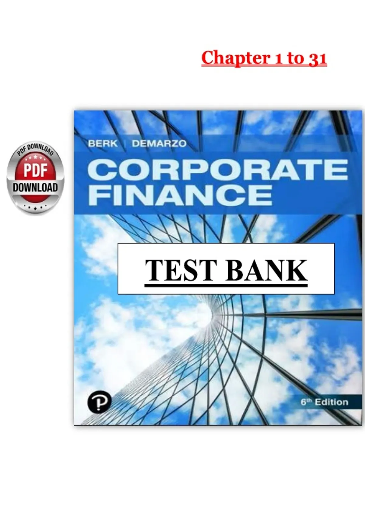 INSTANT PDF DOWNLOAD This Test Bank for Corporate Finance, 6th Edition by Jonathan Berk and Peter DeMarzo provides full coverage of Chapters 1–31. It includes exam-ready multiple-choice questions, numerical problem sets, conceptual finance questions, and real-world corporate finance applications. Topics include time value of money, discounted cash flow, bond and stock valuation, capital budgeting, risk and return, cost of capital, capital structure, payout policy, financial modeling, and valuation. Ideal for undergraduate and MBA students in finance, accounting, economics, and business programs. corporate finance test bank, berk demarzo test bank, corporate finance 6th edition pdf, berk corporate finance test bank, demarzo corporate finance pdf, corporate finance exam questions, finance test bank pdf, capital budgeting test bank, time value of money test bank, valuation test bank pdf, cost of capital test bank, financial modeling test bank, mba finance test bank, undergraduate finance test bank, corporate finance chapters 1-31, finance multiple choice questions, business finance test bank, corporate valuation test bank, finance instructor test bank, corporate finance 2026 pdf
