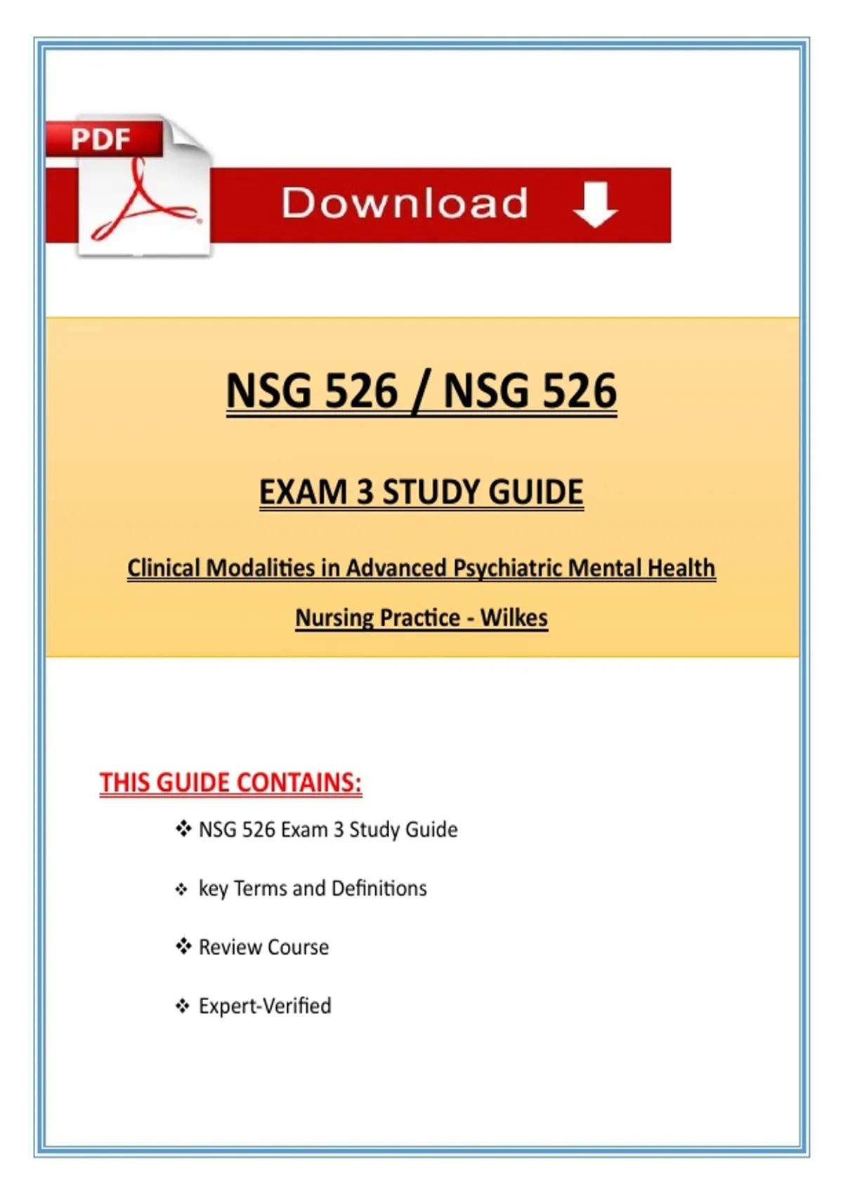 Wilkes NSG 526 Exam 3 Study Guide Clinical Modalities Adv. Psych (Latest 2026 / 2027), 100% Verified Prepare effectively for NSG 526 Exam 3 – Clinical Modalities in Advanced Psychiatric Mental Health Nursing Practice at Wilkes University with this comprehensive Study Guide, available as an Instant PDF Download. Designed for PMHNP and graduate nursing students, this guide includes organized exam-focused notes, concept breakdowns, practice questions with verified answers, and expert explanations. It covers advanced psychiatric nursing topics such as psychotherapeutic modalities, psychopharmacology, trauma-informed care, crisis intervention, evidence-based psychiatric interventions, treatment planning, and advanced clinical decision-making. Complete NSG 526 Exam 3 study guide Clear concept summaries & structured notes Practice questions with verified answers Covers advanced psychiatric clinical modalities & therapy strategies Instant PDF download – start studying immediately Printable and mobile-friendly format NSG 526 Exam 3 Study Guide Advanced Psychiatric Mental Health Nursing Clinical Modalities Wilkes Wilkes University PMHNP exam NSG 526 practice questions Psychotherapeutic modalities study guide Psychopharmacology nursing exam Trauma-informed psychiatric care Crisis intervention mental health Evidence-based psychiatric interventions Treatment planning mental health nursing Graduate nursing exam PDF PMHNP study guide Advanced psychiatric nursing review Verified NSG 526 exam prep