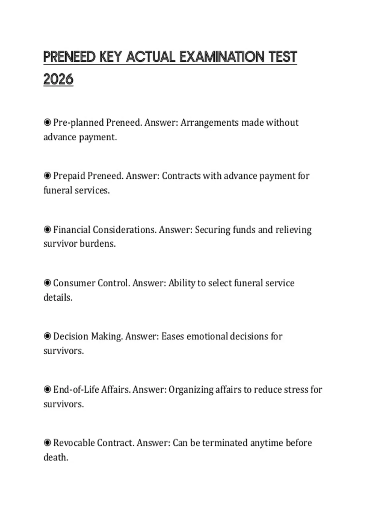 ◉ Prepaid Preneed. Answer: Contracts with advance payment for