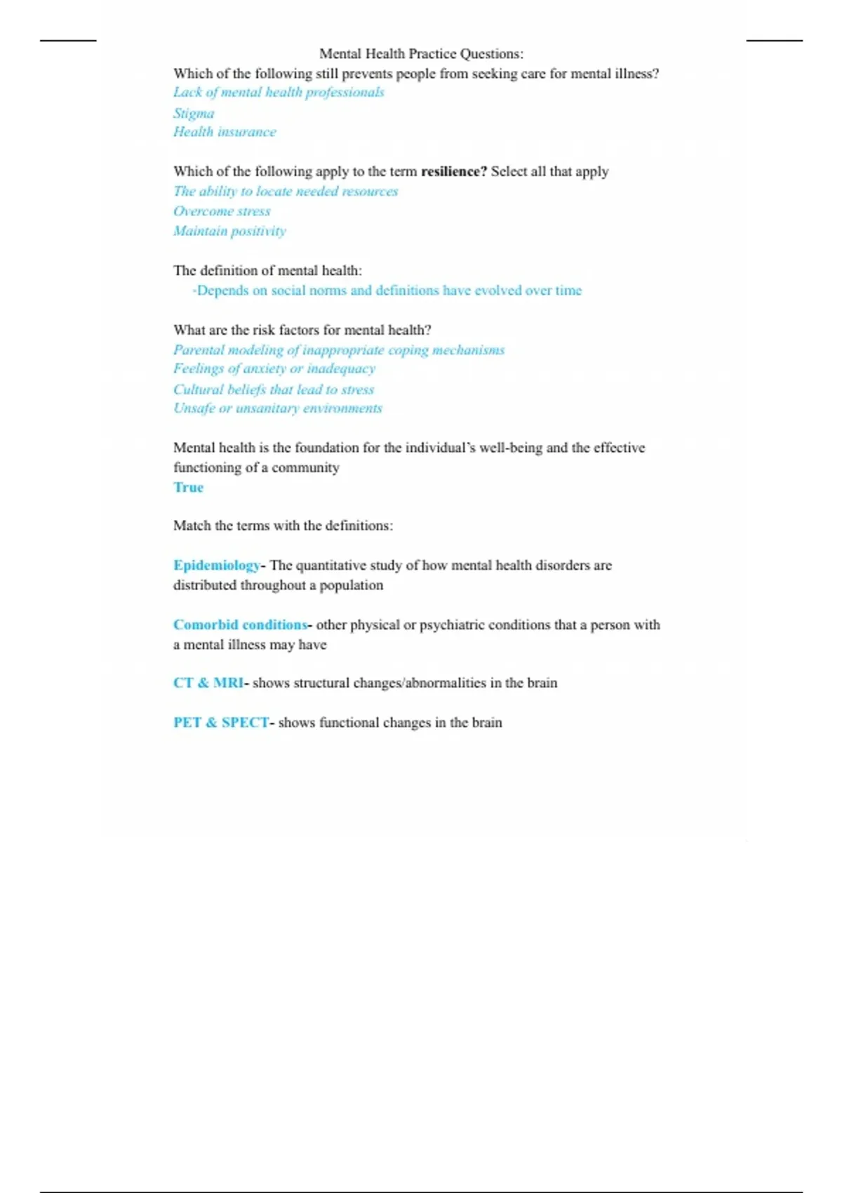 Mental Health Exam Preparation Key Concepts and Practice Questions for NURS 101