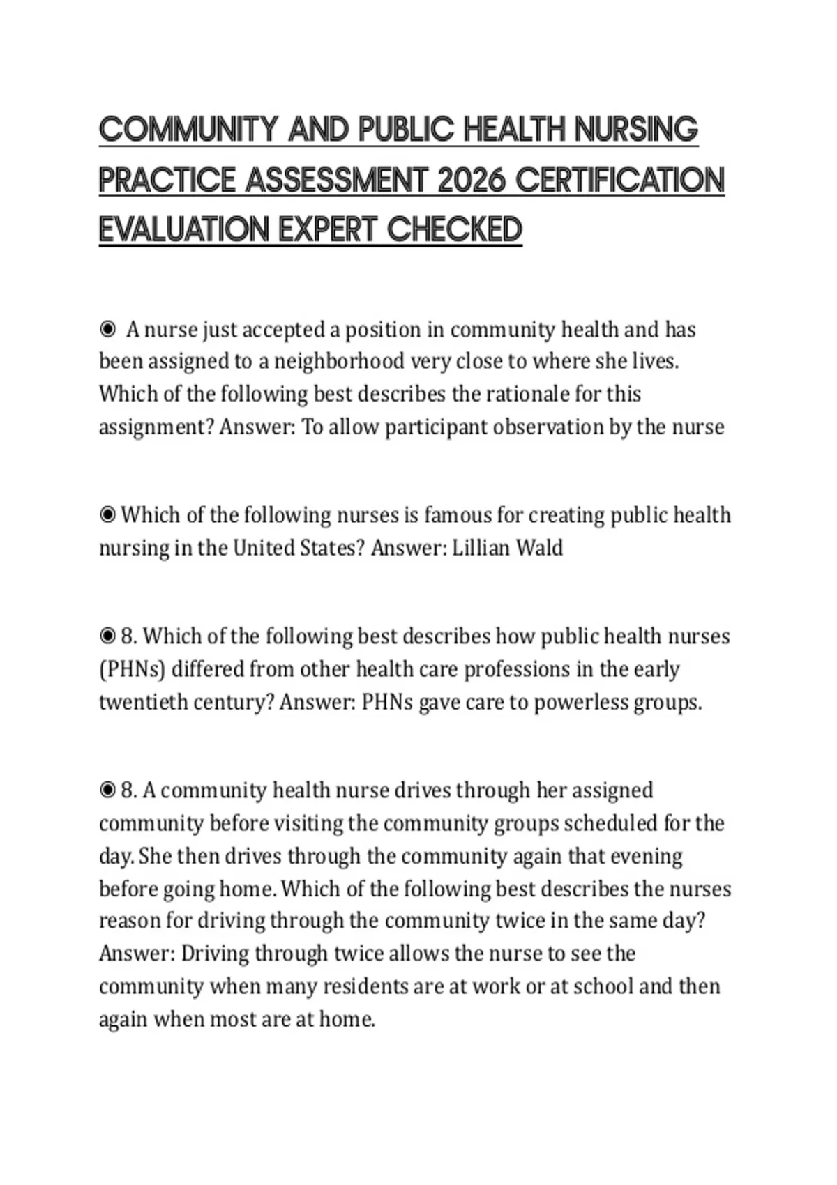 COMMUNITY AND PUBLIC HEALTH NURSING PRACTICE ASSESSMENT 2026 CERTIFICATION EVALUATION EXPERT CHECKED