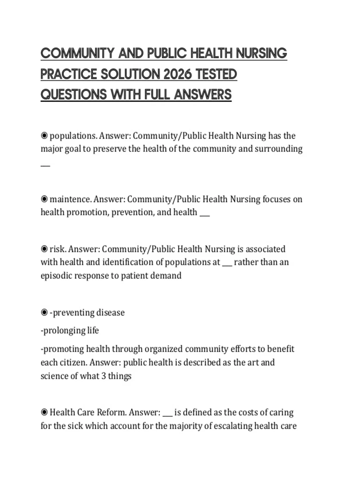 COMMUNITY AND PUBLIC HEALTH NURSING PRACTICE SOLUTION 2026 TESTED QUESTIONS WITH FULL ANSWERS