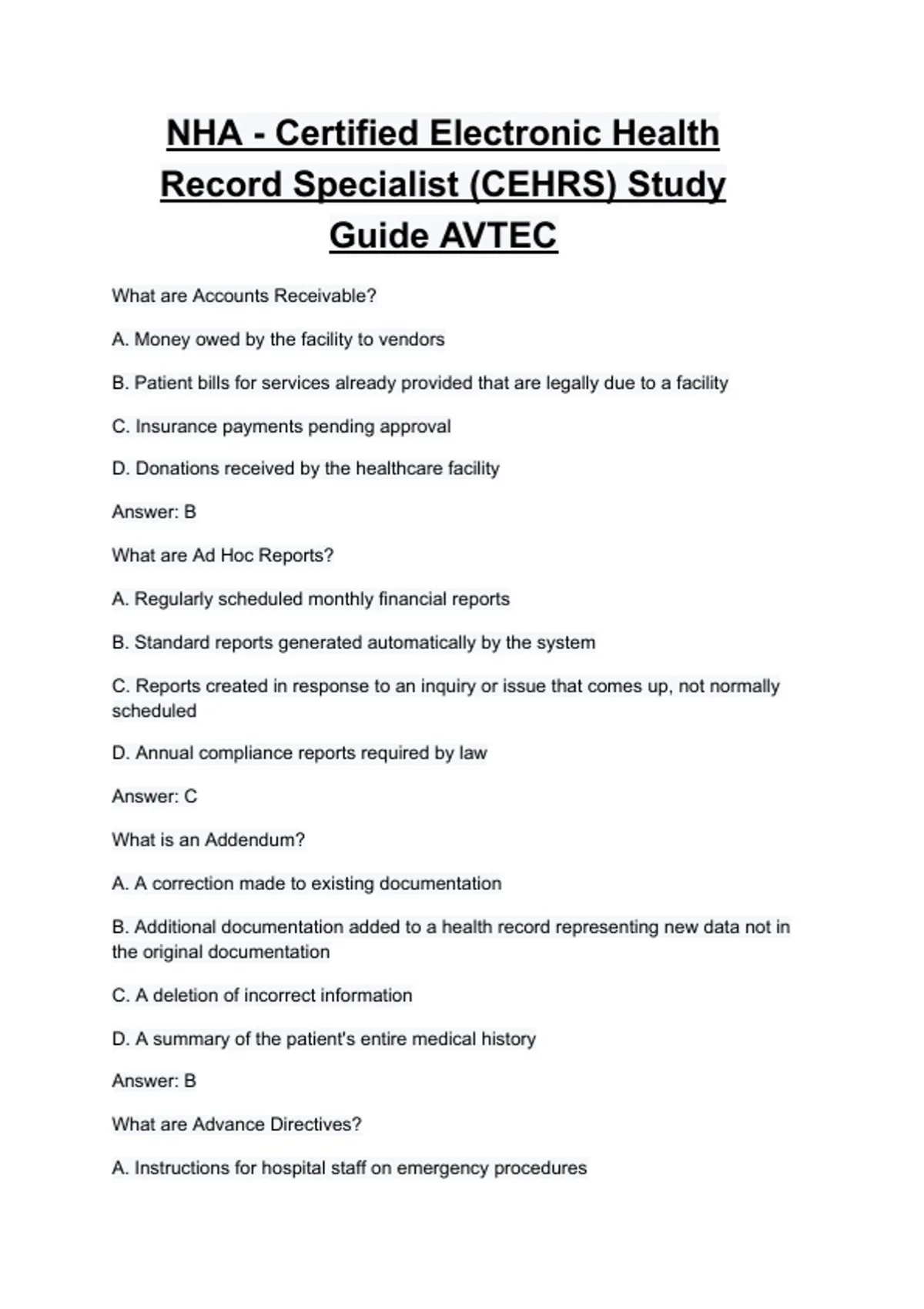 NHA - Certified Electronic Health Record Specialist (CEHRS) Study Guide AVTEC |Questions and Correct Answers (100% VERIFIED)| 2026/2027