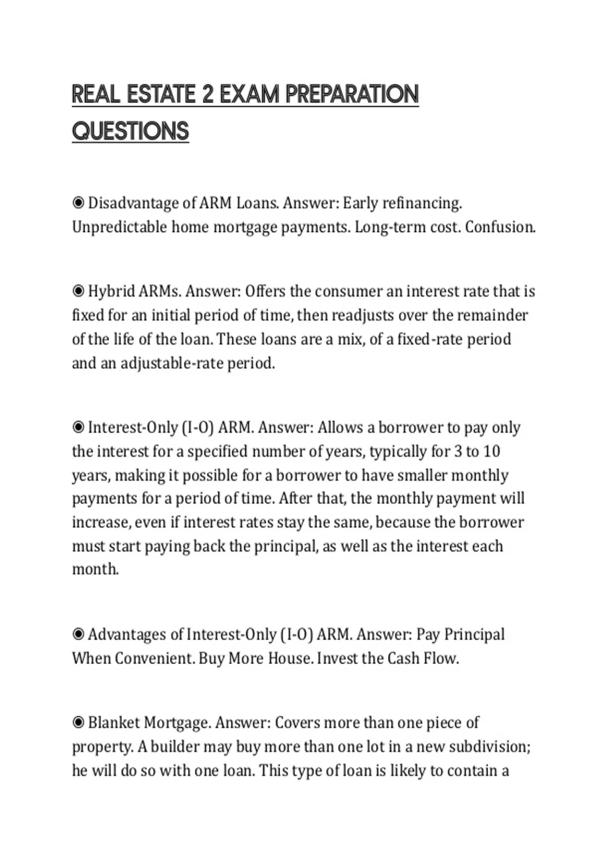 ◉ Interest-Only (I-O) ARM. Answer: Allows a borrower to pay only