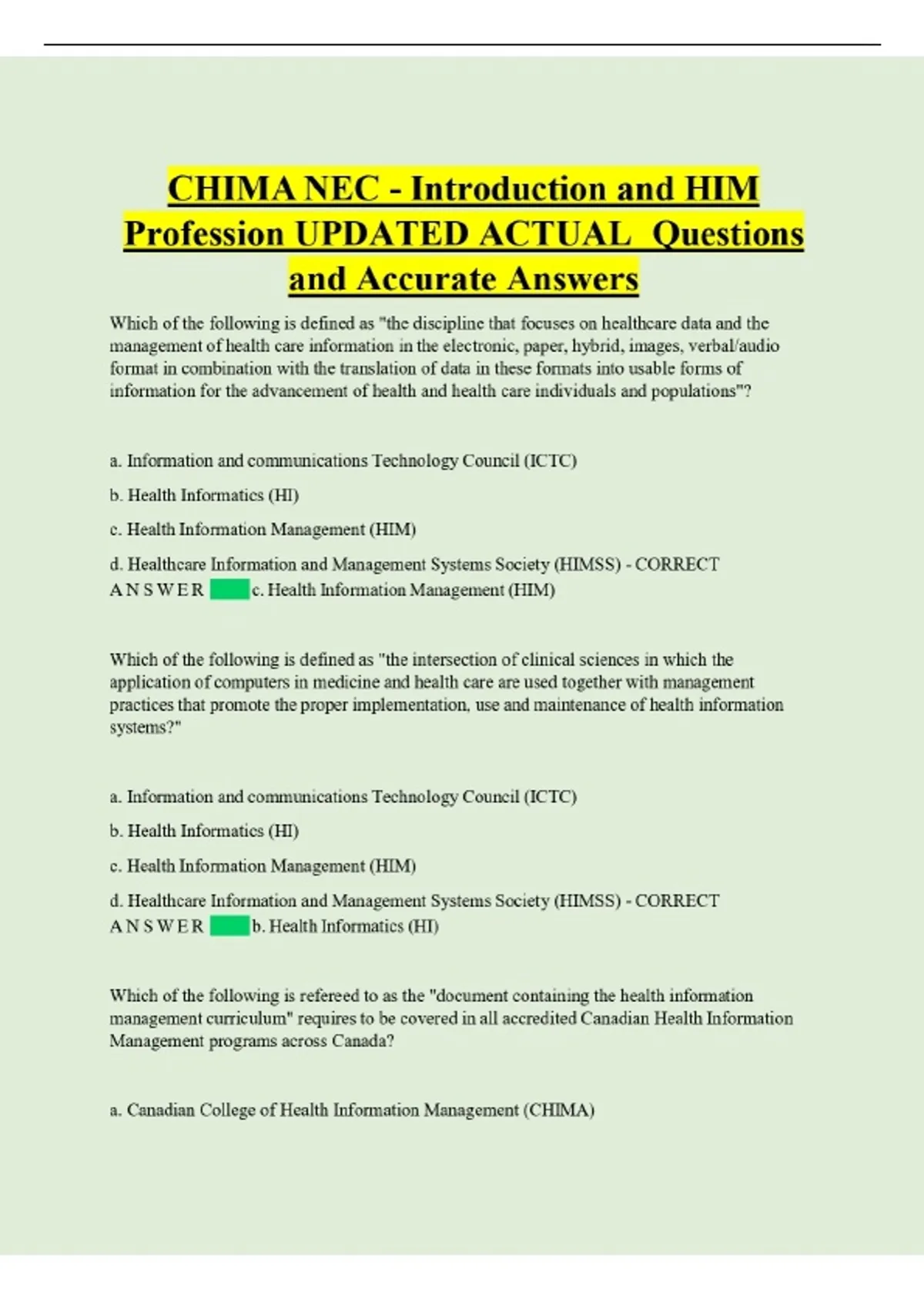 CHIMA NEC - Introduction and HIM Profession UPDATED ACTUAL Questions and Accurate Answers