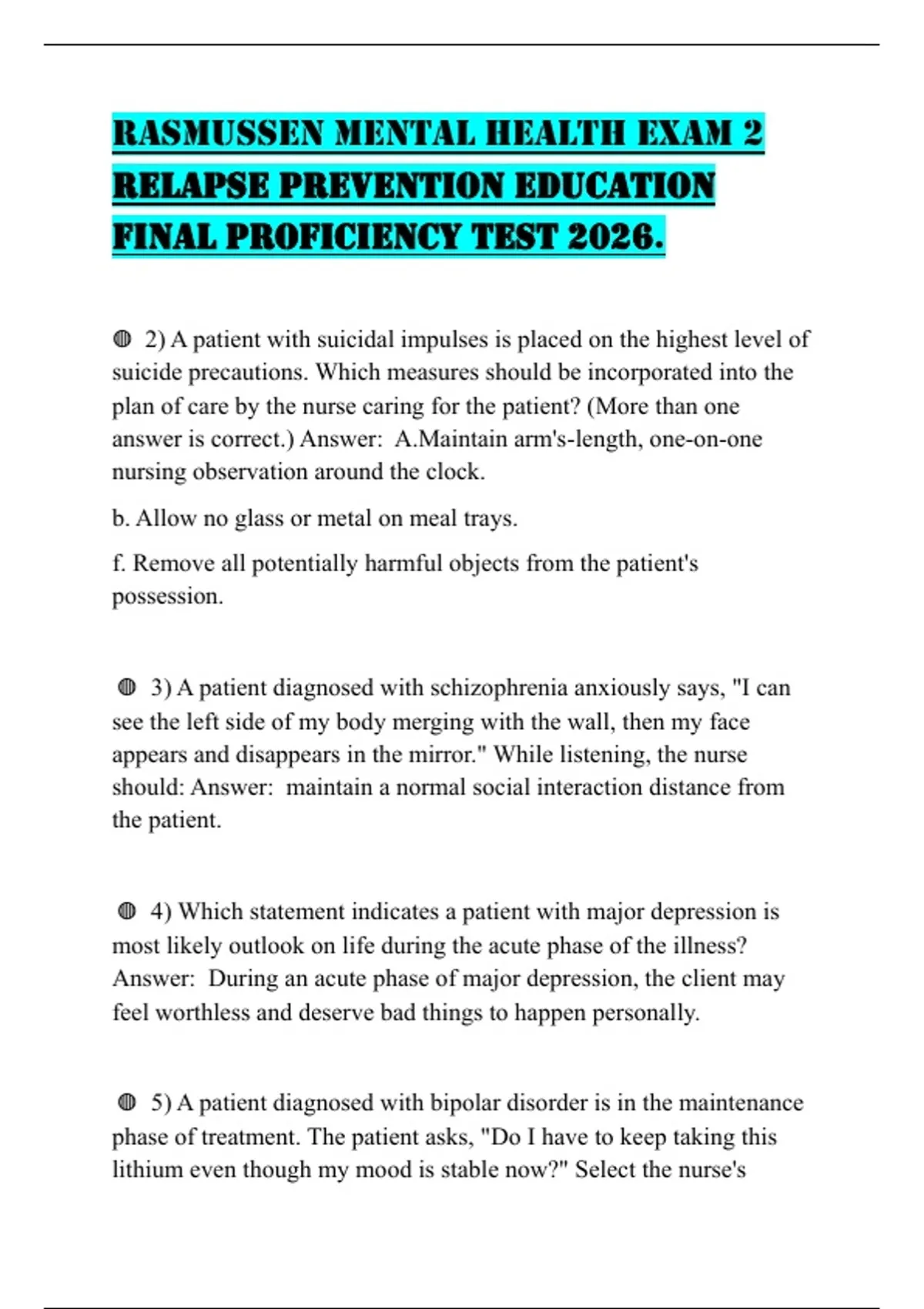 RASMUSSEN MENTAL HEALTH EXAM 2 RELAPSE PREVENTION EDUCATION FINAL PROFICIENCY TEST 2026.
