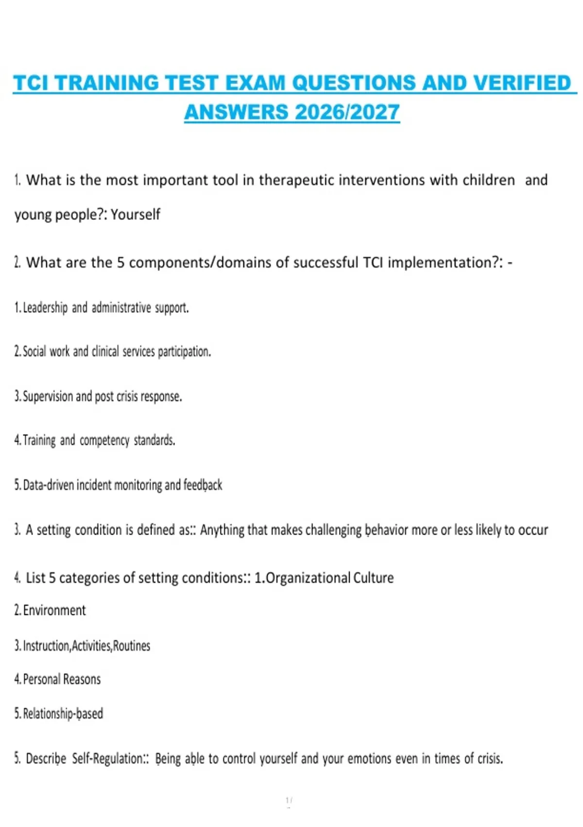 This document provides TCI (Therapeutic Crisis Intervention) training test exam questions with fully verified correct answers. It covers essential TCI concepts including crisis prevention, de-escalation strategies, emotional first aid, behavior support techniques, and post-crisis response, supporting effective preparation for the 2026/2027 training and assessment cycle.