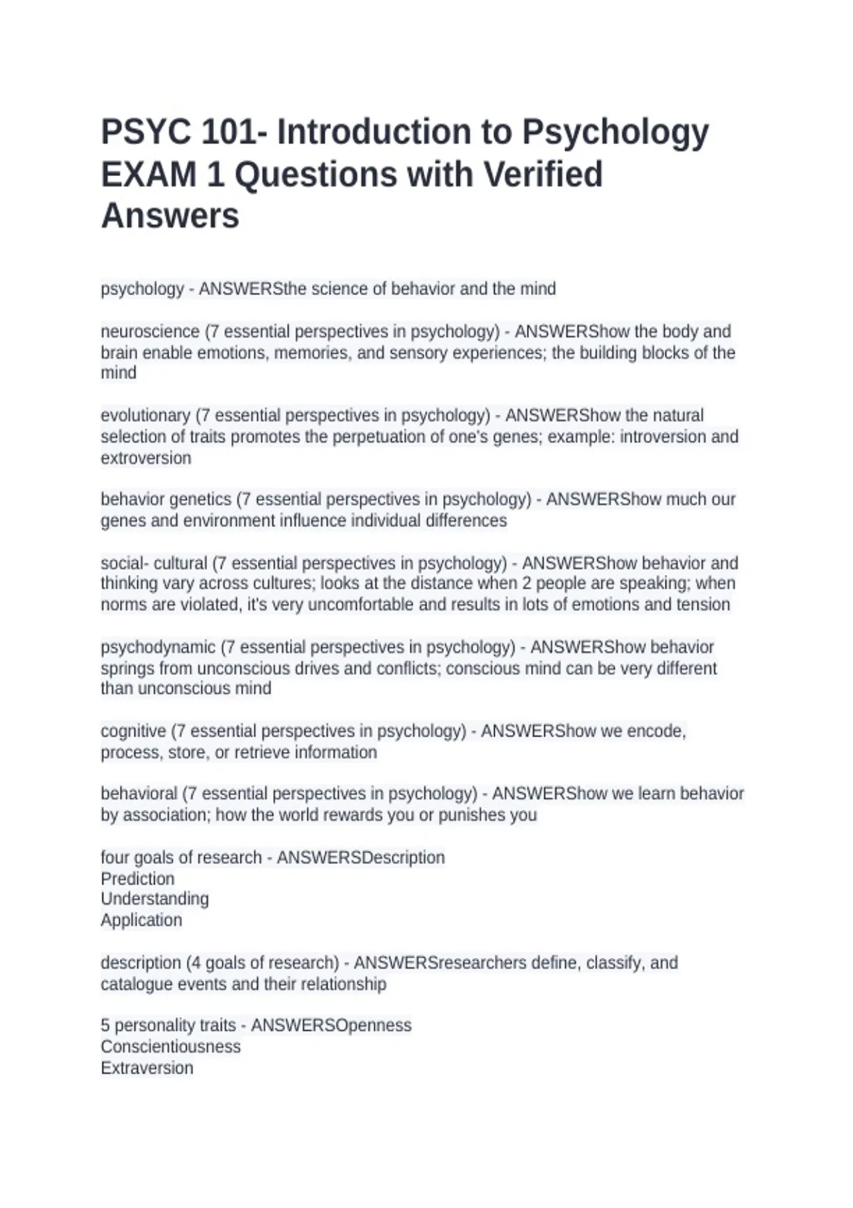 psychology - ANSWERSthe science of behavior and the mind neuroscience (7 essential perspectives in psychology) - ANSWERShow the body and brain enable emotions, memories, and sensory experiences; the building blocks of the mind evolutionary (7 essential perspectives in psychology) - ANSWERShow the natural selection of traits promotes the perpetuation of one's genes; example: introversion and extroversion behavior genetics (7 essential perspectives in psychology) - ANSWERShow much our genes and environment influence individual differences social- cultural (7 essential perspectives in psychology) - ANSWERShow behavior and thinking vary across cultures; looks at the distance when 2 people are speaking; when norms are violated, it's very uncomfortable and results in lots of emotions and tension psychodynamic (7 essential perspectives in psychology) - ANSWERShow behavior springs from unconscious drives and conflicts; conscious mind can be very different than unconscious mind cognitive (7 essential perspectives in psychology) - ANSWERShow we encode, process, store, or retrieve information behavioral (7 essential perspectives in psychology) - ANSWERShow we learn behavior by association; how the world rewards you or punishes you four goals of research - ANSWERSDescription Prediction Understanding Application description (4 goals of research) - ANSWERSresearchers define, classify, and catalogue events and their relationship 5 personality traits - ANSWERSOpenness Conscientiousness Extraversion Agreeableness Neuroticism