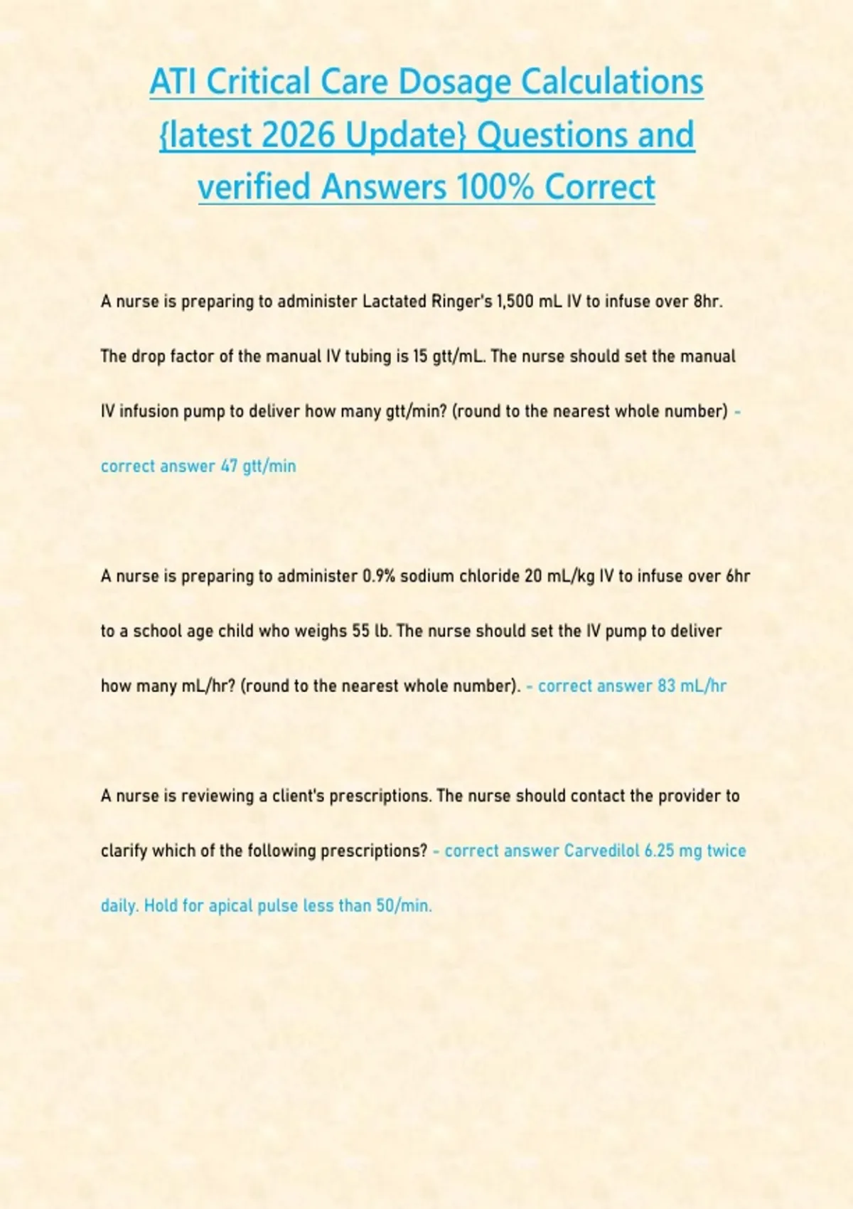 ATI Critical Care Dosage Calculations -latest 2026 Update- Questions and verified Answers 100-CORRECT