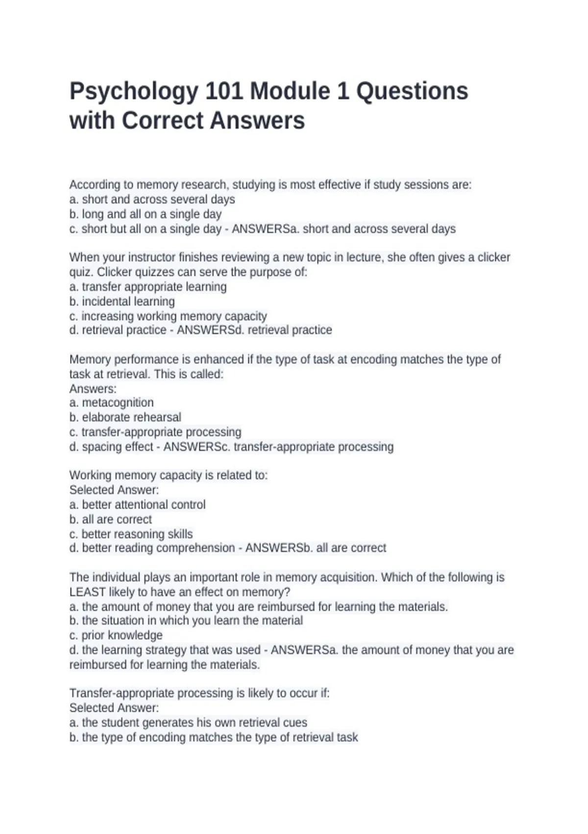 According to memory research, studying is most effective if study sessions are: a. short and across several days b. long and all on a single day c. short but all on a single day - ANSWERSa. short and across several days When your instructor finishes reviewing a new topic in lecture, she often gives a clicker quiz. Clicker quizzes can serve the purpose of: a. transfer appropriate learning b. incidental learning c. increasing working memory capacity d. retrieval practice - ANSWERSd. retrieval practice Memory performance is enhanced if the type of task at encoding matches the type of task at retrieval. This is called: Answers: a. metacognition b. elaborate rehearsal c. transfer-appropriate processing d. spacing effect - ANSWERSc. transfer-appropriate processing Working memory capacity is related to: Selected Answer: a. better attentional control b. all are correct c. better reasoning skills d. better reading comprehension - ANSWERSb. all are correct The individual plays an important role in memory acquisition. Which of the following is LEAST likely to have an effect on memory? a. the amount of money that you are reimbursed for learning the materials. b. the situation in which you learn the material c. prior knowledge d. the learning strategy that was used - ANSWERSa. the amount of money that you are reimbursed for learning the materials.
