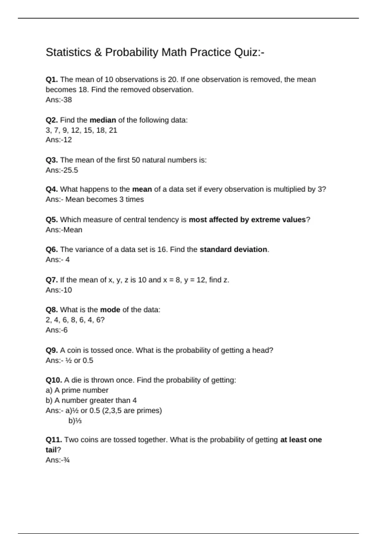 This document contains a collection of statistics and probability practice questions with clear answers, covering core concepts such as mean, median, mode, variance, standard deviation, and basic probability rules. The material also includes short theoretical notes that summarize key formulas and definitions, making it suitable for revision, self-study, and exam preparation.