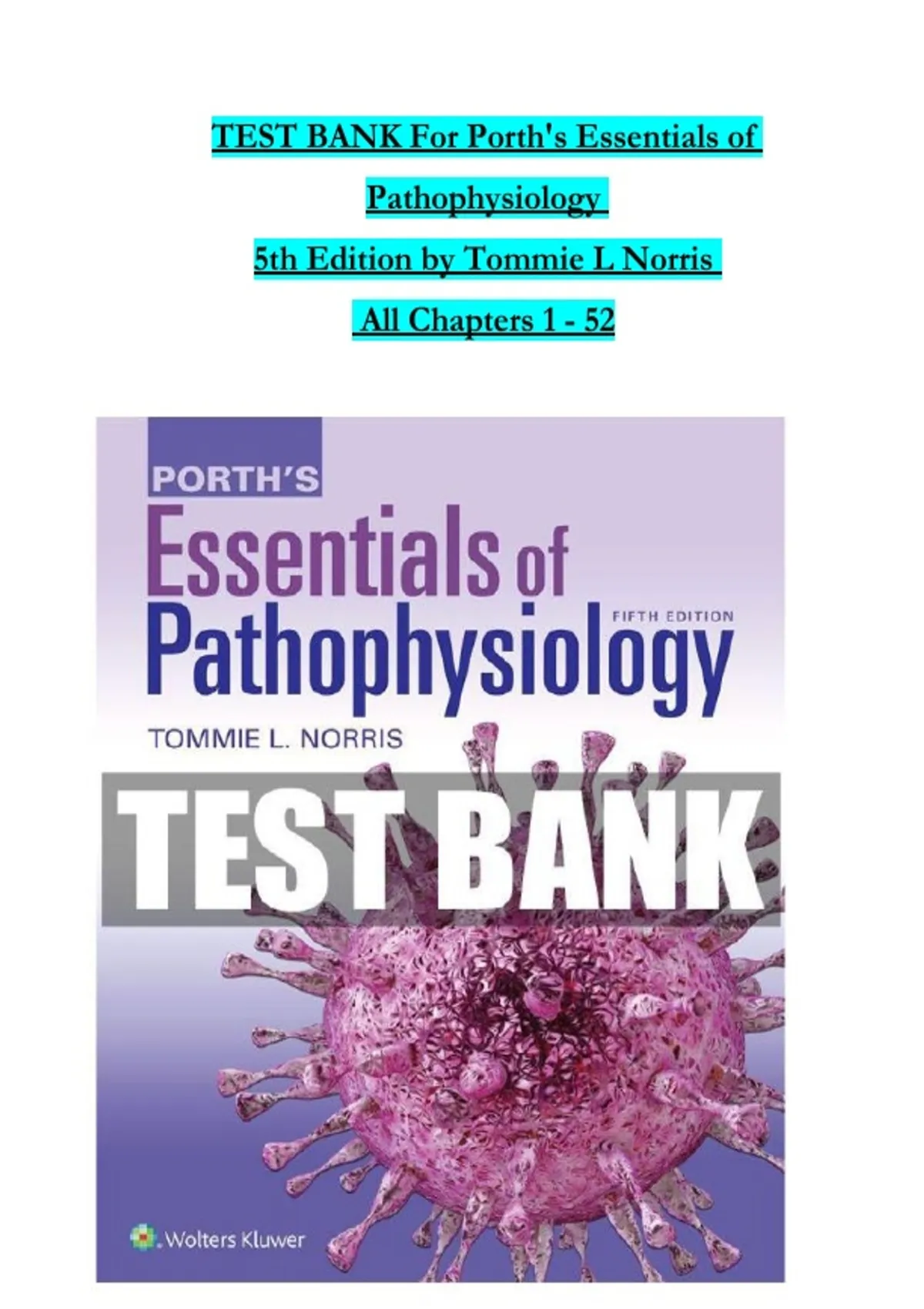 TEST BANK For Porth's Essentials of Pathophysiology 5th Edition by Tommie L Norris All Chapters 1 - 52 Porth's Essentials of Pathophysiology / Edition 5 by Tommie L NorrisTable of Contents Chapter 1-- Concepts of Health and Disease Chapter 2 -- Cell and Tissue Characteristics Chapter 3 -- Cellular Adaptation, Injury, and Death Chapter 4 -- Genetic Control of Cell Function and Inheritance Chapter 5 -- Genetic and Congenital Disorders Chapter 6 -- Neoplasia Chapter 7 -- Stress and Adaptation Chapter 8 -- Disorders of Fluid, Electrolyte, and Acid–Base Balance Chapter 9 -- Inflammation, Tissue Repair, and Wound Healing Chapter 10 -- Mechanisms of Infectious Disease Chapter 11-- Innate and Adaptive Immunity Chapter 12 -- Disorders of the Immune Response, Including HIV/AIDS Chapter 13 -- Organization and Control of Neural Function Chapter 14 -- Somatosensory Function, Pain, Headache, and Temperature Regulation Chapter 15 -- Disorders of Motor Function Chapter 16 -- Disorders of Brain Function Chapter 17 -- Sleep and Sleep–Wake Disorders Chapter 18 -- Disorders of Thought, Emotion, and Memory Chapter 19 -- Disorders of Visual Function Chapter 20 -- Disorders of Hearing and Vestibular Function Chapter 21 -- Blood Cells and the Hematopoietic System Chapter 22 -- Disorders of Hemostasis Chapter 23 -- Disorders of Red Blood Cells Chapter 24 -- Disorders of White Blood Cells and Lymphoid Tissues Chapter 25 -- Structure and Function of the Cardiovascular System Chapter 26 -- Disorders of Blood Flow and Blood Pressure Regulation Chapter 27 -- Disorders of Cardiac Function, and Heart Failure and Circulatory Shock Chapter 28 -- Disorders of Cardiac Conduction and Rhythm Chapter 29 -- Structure and Function of the Respiratory System Chapter 30 -- Respiratory Tract Infections, Neoplasms, and Childhood DisordersChapter 31 -- Disorders of Ventilation and Gas Exchange Chapter 32 -- Structure and Function of the Kidney Chapter 33 -- Disorders of Renal Function Chapter 34 -- Acute Kidney Injury and Chronic Kidney Disease Chapter 35 -- Disorders of the Bladder and Lower Urinary Tract Chapter 36 -- Structure and Function of the Gastrointestinal System Chapter 37 -- Disorders of Gastrointestinal Function Chapter 38 -- Disorders of Hepatobiliary and Exocrine Pancreas FunctionChapter 39 -- Alterations in Nutritional Status Chapter 40 -- Mechanisms of Endocrine Control1 Chapter 41-- Disorders of Endocrine Control of Growth and Metabolism Chapter 42 -- Structure and Function of the Male Genitourinary System Chapter 43 -- Disorders of the Male Reproductive System Chapter 44 -- Structure and Function of the Female Reproductive System Chapter 45 -- Disorders of the Female Reproductive System Chapter 46 -- Sexually Transmitted Infections Chapter 47 -- Structure and Function of the Musculoskeletal System Chapter 48 -- Disorders of Musculoskeletal Function: Trauma, Infection, Neoplasms1 Chapter 49 -- Disorders of Musculoskeletal Function: Developmental and Metabolic Disorders, ActivityIntolerance, and Fatigue Chapter 50 -- Disorders of Musculoskeletal Function: Rheumatic DisordersChapter 51 -- Structure and Function of the Skin Chapter 52 -- Disorders of Skin Integrity and Function