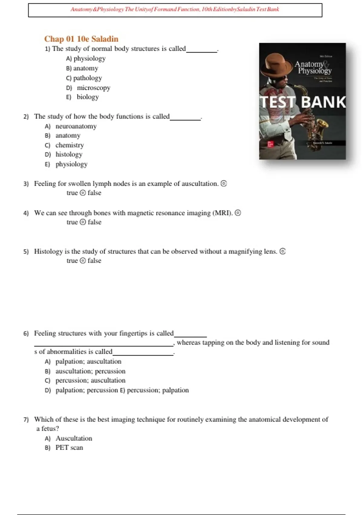 This Test Bank for Anatomy & Physiology: The Unity of Form and Function, 10th Edition by Kenneth S. Saladin is a comprehensive exam preparation resource designed to support students studying human anatomy and physiology. Updated for 2026, the test bank provides chapter-by-chapter practice questions with accurate, verified answers, fully aligned with the 10th Edition textbook content. It covers all major body systems and core A&P concepts, helping learners reinforce understanding and prepare effectively for quizzes, midterms, finals, and standardized exams. The content is well-organized by chapters for easy navigation and focused revision, making it ideal for self-study, exam review, and instructor-led courses. What’s Included: Chapter-aligned test bank questions Correct and verified answers Full coverage of all major anatomy & physiology systems Matches Saladin 10th Edition Latest 2026 update Ideal for exam prep, practice tests, and revision A reliable and structured A&P test bank to help you study efficiently and perform confidently.