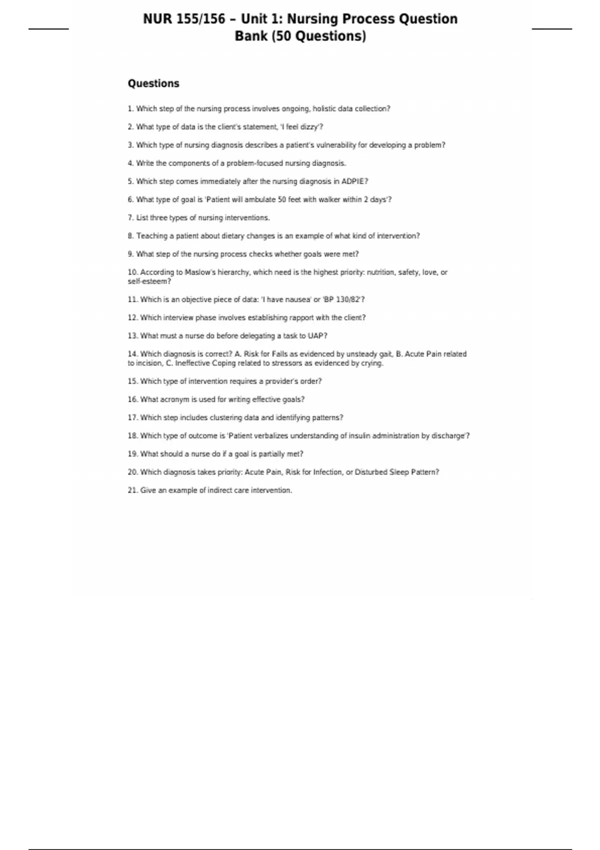 NUR 155 Unit 1 Nursing Process Question Bank 50 Questions | Questions and Answers | Latest Update | Correct Answers