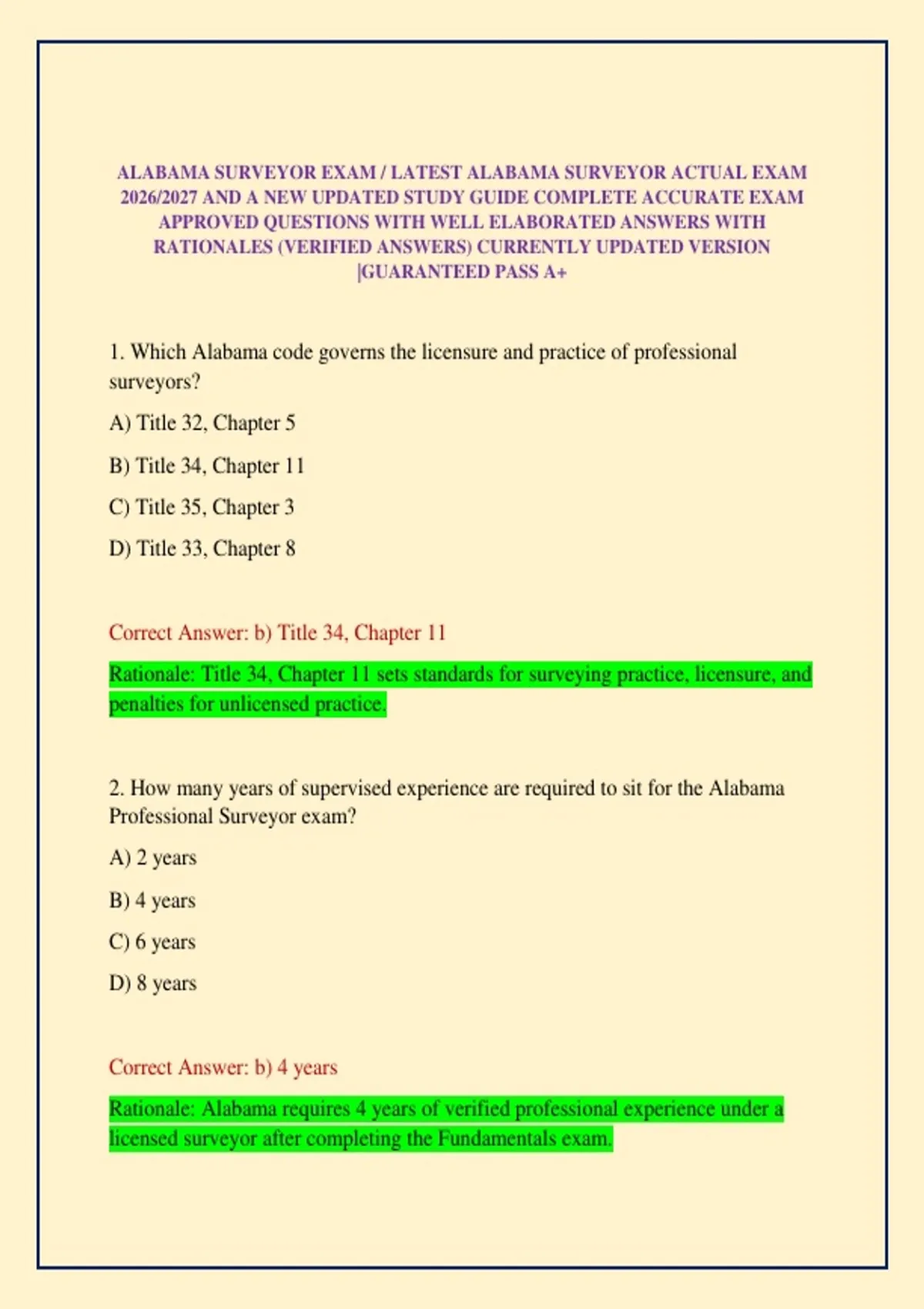 ALABAMA SURVEYOR EXAM / LATEST ALABAMA SURVEYOR ACTUAL EXAM 2026/2027 AND A NEW UPDATED STUDY GUIDE COMPLETE ACCURATE EXAM APPROVED QUESTIONS WITH WELL ELABORATED ANSWERS WITH RATIONALES (VERIFIED ANSWERS) CURRENTLY UPDATED VERSION |GUARANTEED PASS A+