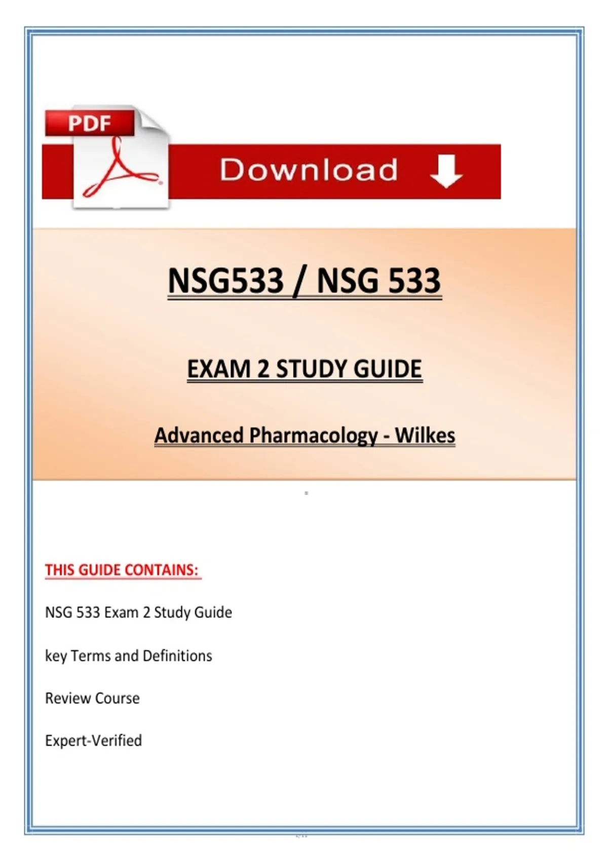 Wilkes NSG 533 Exam 2 Study Guide Advanced Pharmacology | Updated 2026 / 2027 Verified by Experts Prepare effectively for NSG 533 Exam 2 – Advanced Pharmacology at Wilkes University with this comprehensive Study Guide, available as an Instant PDF Download for graduate nursing and advanced practice students. This resource includes exam-focused pharmacology notes, practice questions with verified answers, expert rationales, and medication-focused summaries to strengthen understanding of advanced drug therapy, pharmacokinetics, medication safety, and clinical prescribing decisions. Designed to support safe prescribing, clinical judgment, and exam success, this guide reinforces high-priority pharmacology concepts commonly tested in Exam 2. Pharmacokinetics & pharmacodynamics Drug interactions, contraindications & safety warnings Cardiovascular & antihypertensive medications CNS & psychiatric pharmacology Endocrine, diabetes & hormonal therapies Antimicrobials & anti-infective agents Pain management, opioids & controlled substances Respiratory & allergy medications Renal & hepatic medication adjustments Adverse drug reactions, toxicity & overdose management Clinical medication case scenarios & evidence-based prescribing NSG 533 Exam 2 Study Guide PDF Practice questions with verified answers Detailed rationales & explanations Drug-focused review summaries Instant digital download Printable & mobile-friendly format NSG 533 Exam 2 Study Guide Advanced Pharmacology Wilkes Wilkes University nursing Graduate nursing pharmacology NSG 533 practice questions Advanced pharmacology study guide Nurse practitioner pharmacology Drug interactions nursing Pharmacokinetics nursing Psychiatric medications PMHNP Cardiovascular drugs nursing Antibiotics nursing exam Endocrine pharmacology Pain management medications Safe prescribing nursing Medication adverse effects Advanced nursing PDF Wilkes nursing exam prep NSG 533 review guide Instant PDF nursing prep Graduate pharmacology exam