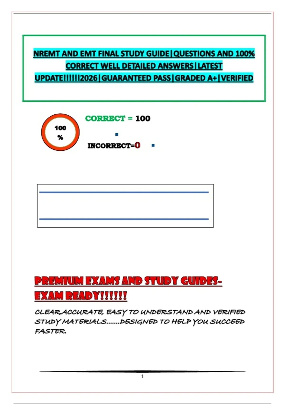 NREMT AND EMT FINAL STUDY GUIDE|QUESTIONS AND 100% CORRECT WELL DETAILED ANSWERS|LATEST UPDATE!!!!!!2026|GUARANTEED PASS|GRADED A+|VERIFIED