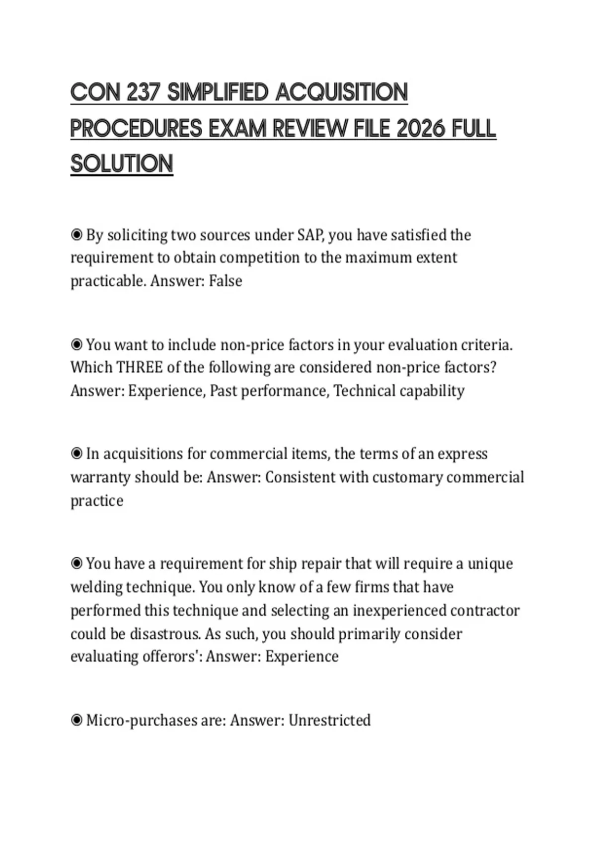 CON 237 SIMPLIFIED ACQUISITION PROCEDURES EXAM REVIEW FILE 2026 FULL SOLUTION