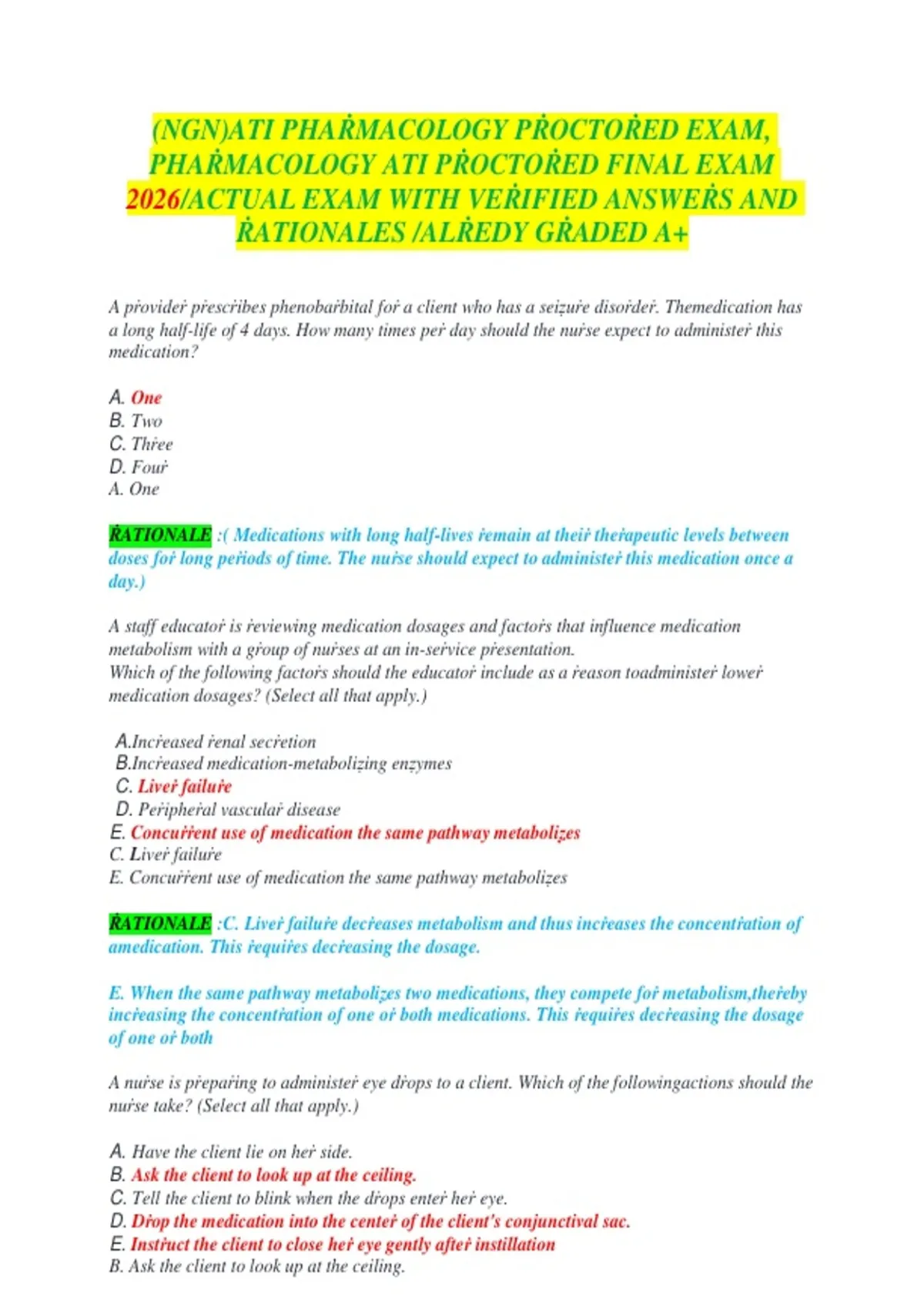 Full Test Bank for ATI RN Pharmacology Proctored Exam (2026 NGN Revised) Complete Coverage Verified Questions & Correct Answers Medication Administration / Pharmacokinetics / Nursing Care Updated 2026 Version
