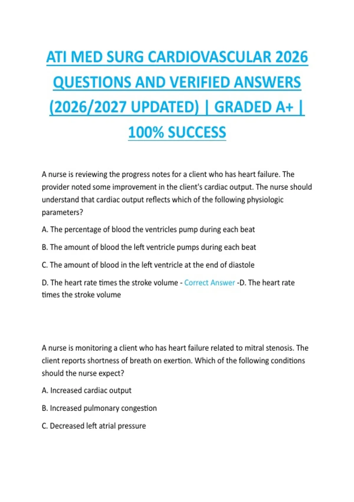 ATI MED SURG CARDIOVASCULAR 2026 QUESTIONS AND VERIFIED ANSWERS (2026/2027 UPDATED) | GRADED A+ | 100% SUCCESS