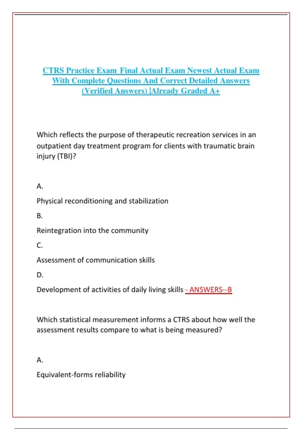 Ace your Certified Therapeutic Recreation Specialist (CTRS) certification with confidence! This comprehensive exam prep PDF includes real, verified questions from the latest test cycles, paired with detailed answer explanations for every single item. Perfect for final review, self-study, or last-minute cramming, this guide covers essential topics like assessment tools, intervention strategies, documentation, ethics, and client populations. Each question is designed to mirror the actual exam format and difficulty, giving you the edge you need to pass on your first try. Don’t just memorize—understand the reasoning behind each answer and walk into your exam fully prepared. Get your copy today and take the next step toward your CTRS credential!