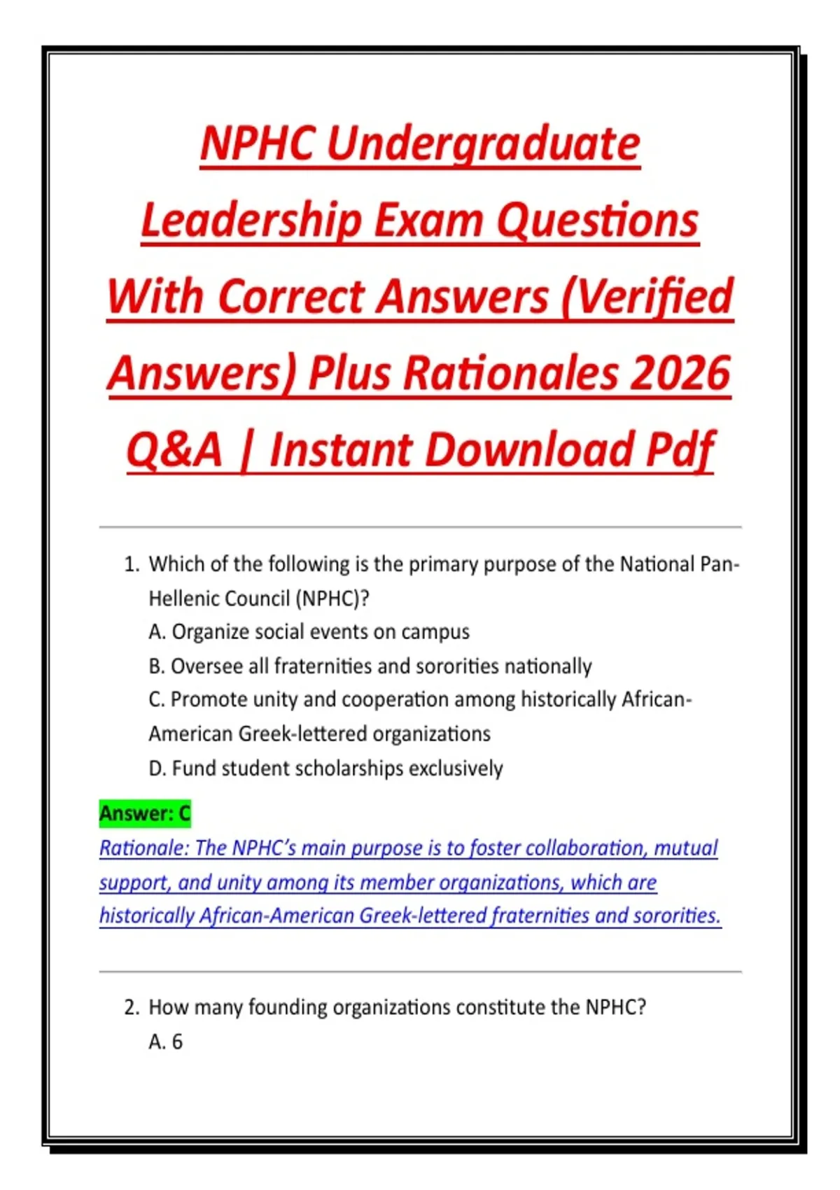 NPHC Undergraduate Leadership Exam Questions With Correct Answers (Verified Answers) Plus Rationales 2026 Q&A | Instant Download Pdf