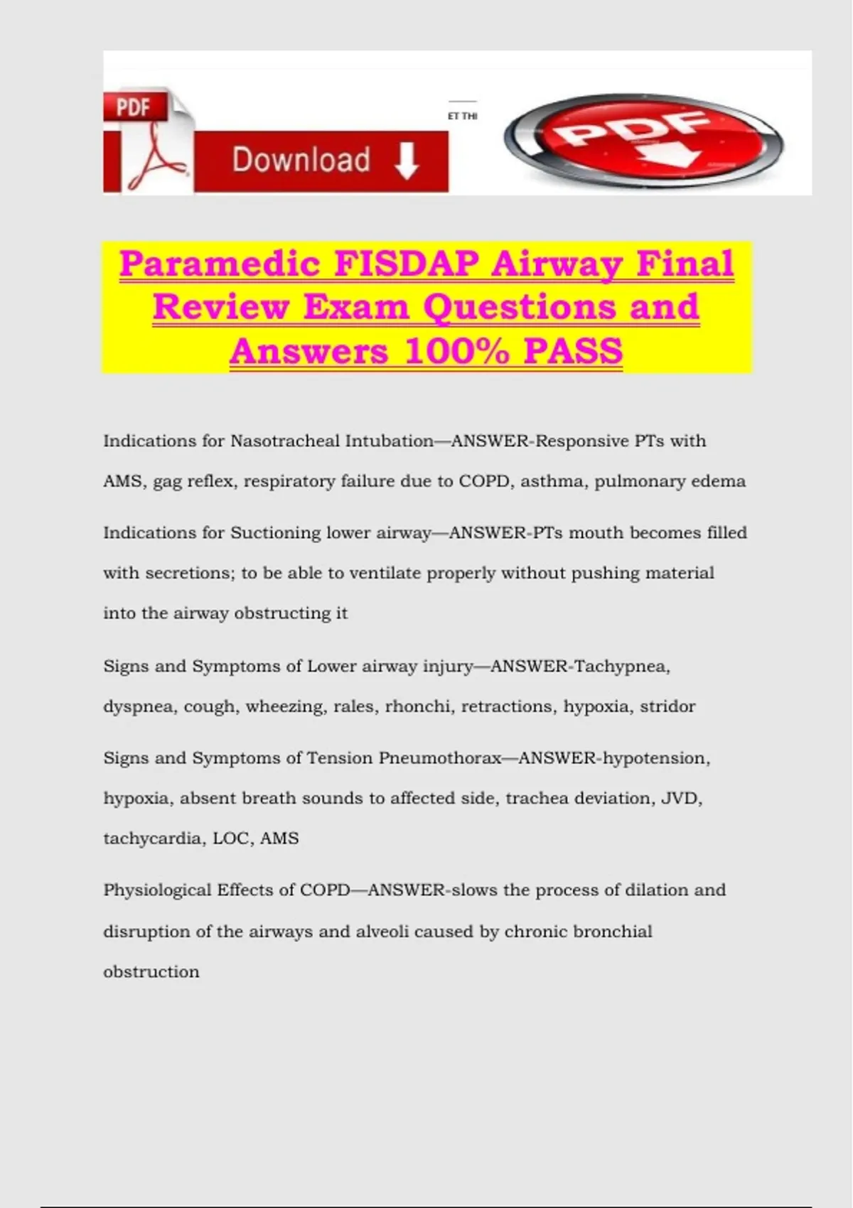 Paramedic FISDAP Airway Final Review Exam Questions and Answers 100% PASS