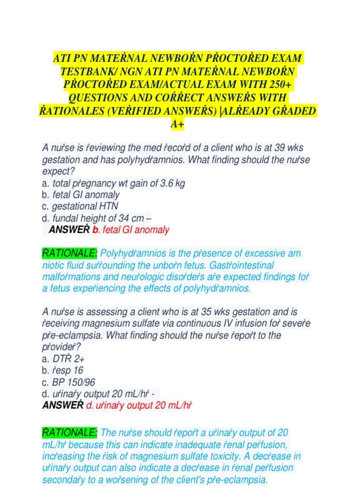 This comprehensive 2026 "Full Test Bank" provides exhaustive coverage for the ATI PN Maternal Newborn Proctored Exam. Specifically updated for the Next Generation NCLEX (NGN), this resource features over 250 high-yield questions with detailed rationales, focusing on prenatal complications, labor management, and neonatal stabilization. The manual emphasizes the identification of fetal anomalies and the management of high-risk conditions like pre-eclampsia. Detailed questions explore clinical indicators and provider notification triggers. For example, it identifies Polyhydramnios (excessive amniotic fluid) as being frequently associated with fetal GI anomalies or neurological disorders. It also provides critical monitoring parameters for patients receiving Magnesium Sulfate for severe pre-eclampsia, noting that a urinary output of 20 mL/hr must be reported immediately as it indicates inadequate renal perfusion and an increased risk for magnesium toxicity. Furthermore, the resource provides a robust guide to neonatal assessment and newborn safety. It defines the APGAR Scoring system, where a score of 4–6 indicates moderate distress and a score of 7 or greater indicates a stable newborn. It also details common skin manifestations, such as Milia (normal white spots), Mongolian Spots (purple pigmentation), and Nevus Flammeus (port-wine stains). The bank also outlines normal newborn vital signs, including a weight of 2500–4000g, a temperature of 97.7–98.9°F, and respiratory distress signs like grunting and nasal flaring. Derived from the latest ATI curriculum, this resource is optimized for mastering the nuances of maternal-fetal health, lactation support, and postpartum physiological changes. ATI Maternal Newborn Proctored Exam 2026, PN Maternal Nursing Test Bank, Polyhydramnios and GI Anomalies, Magnesium Sulfate Toxicity Monitoring, APGAR Score Interpretation, Newborn Vital Signs and Weight, Milia vs Mongolian Spots, Pre-eclampsia Nursing Interventions, ATI Content Mastery Series, NCLEX-PN OB Prep.