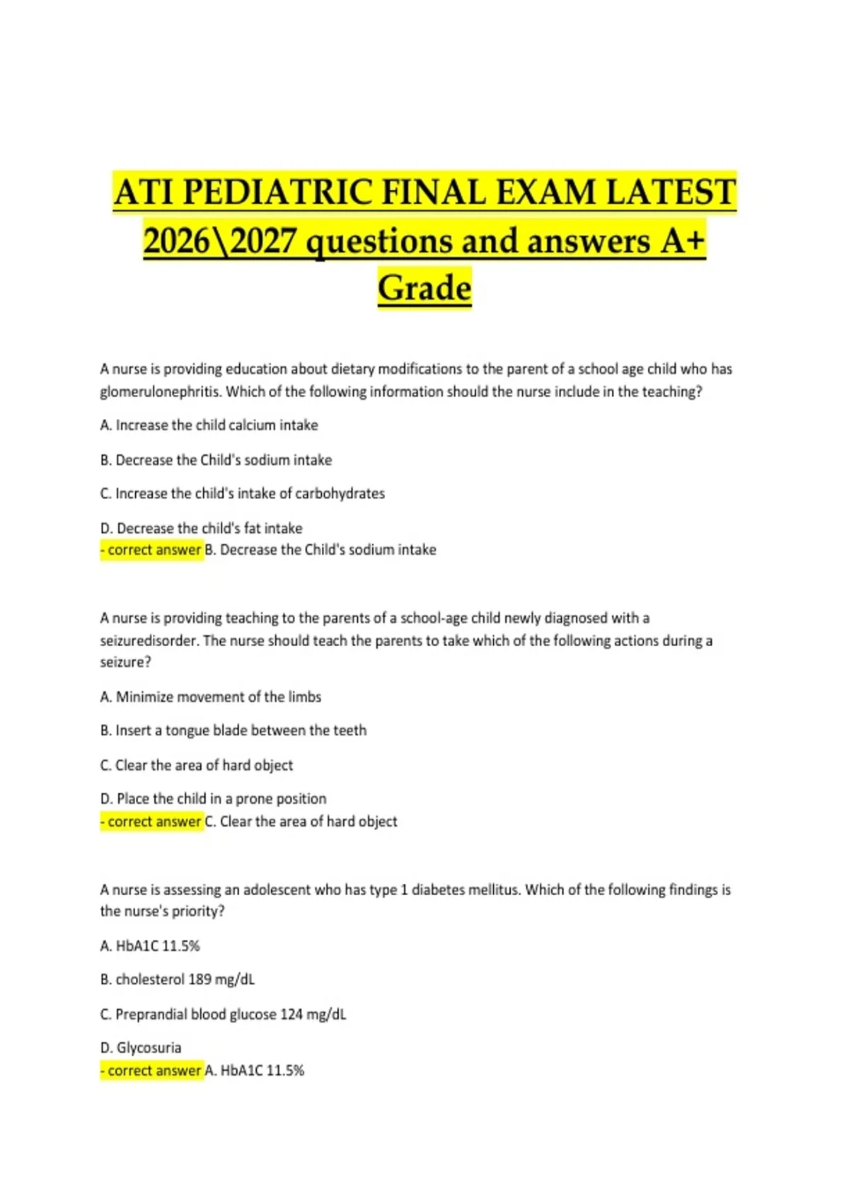 This course offers a comprehensive and up-to-date review for the ATI Pediatric Final Exam (2026–2027), designed to help nursing students master essential pediatric concepts and succeed on their final assessment. The course includes exam-style review questions with carefully verified answers and rationales, aligned with current ATI pediatric nursing standards. Content focuses on reinforcing clinical judgment, prioritization, and safe nursing care across all major pediatric topics commonly tested on the ATI final.