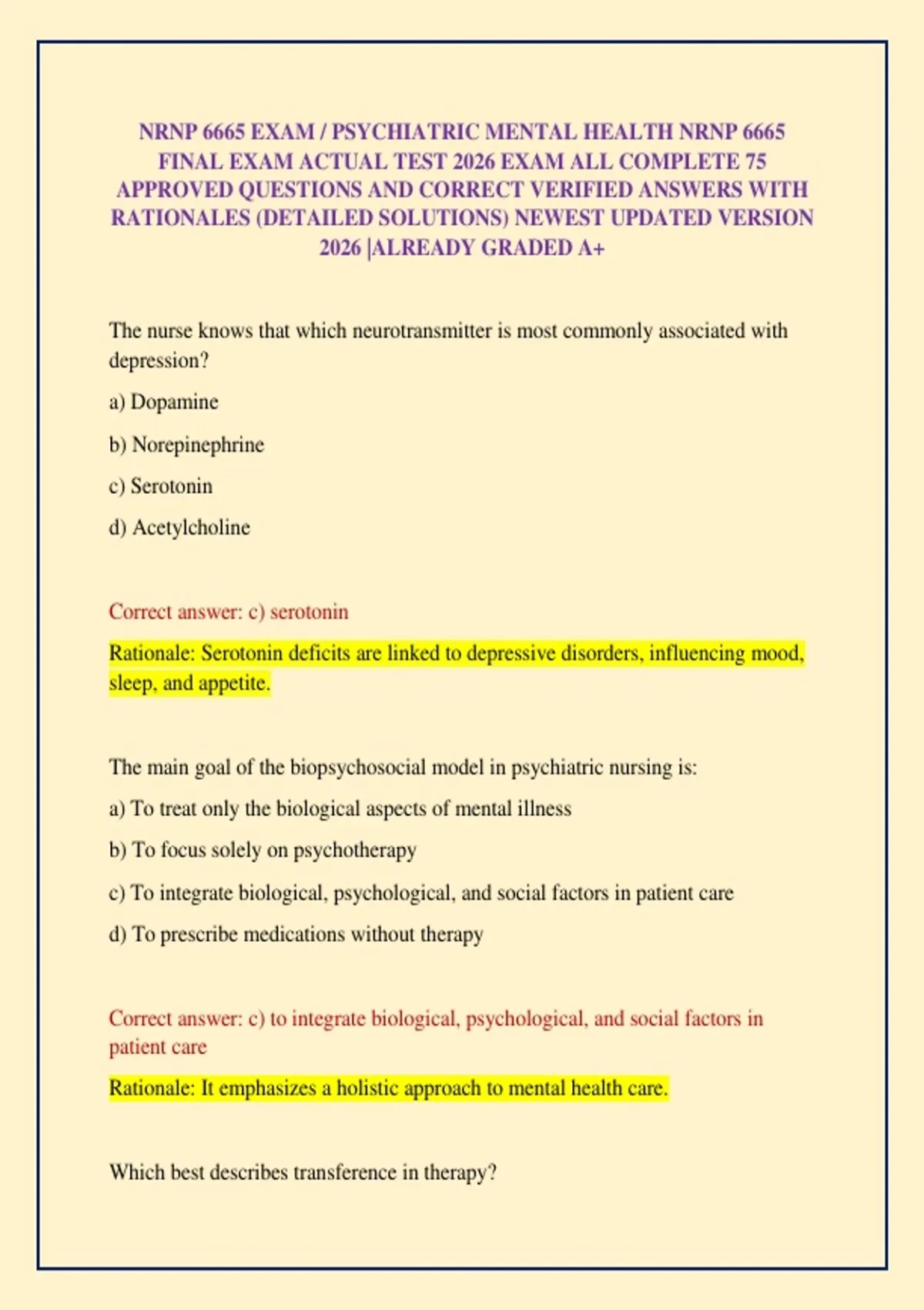 Correct answer: a) patient projecting feelings about others onto the nurse