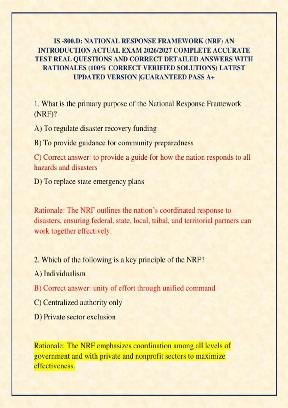 Rationale: The NRF outlines the nation’s coordinated response to