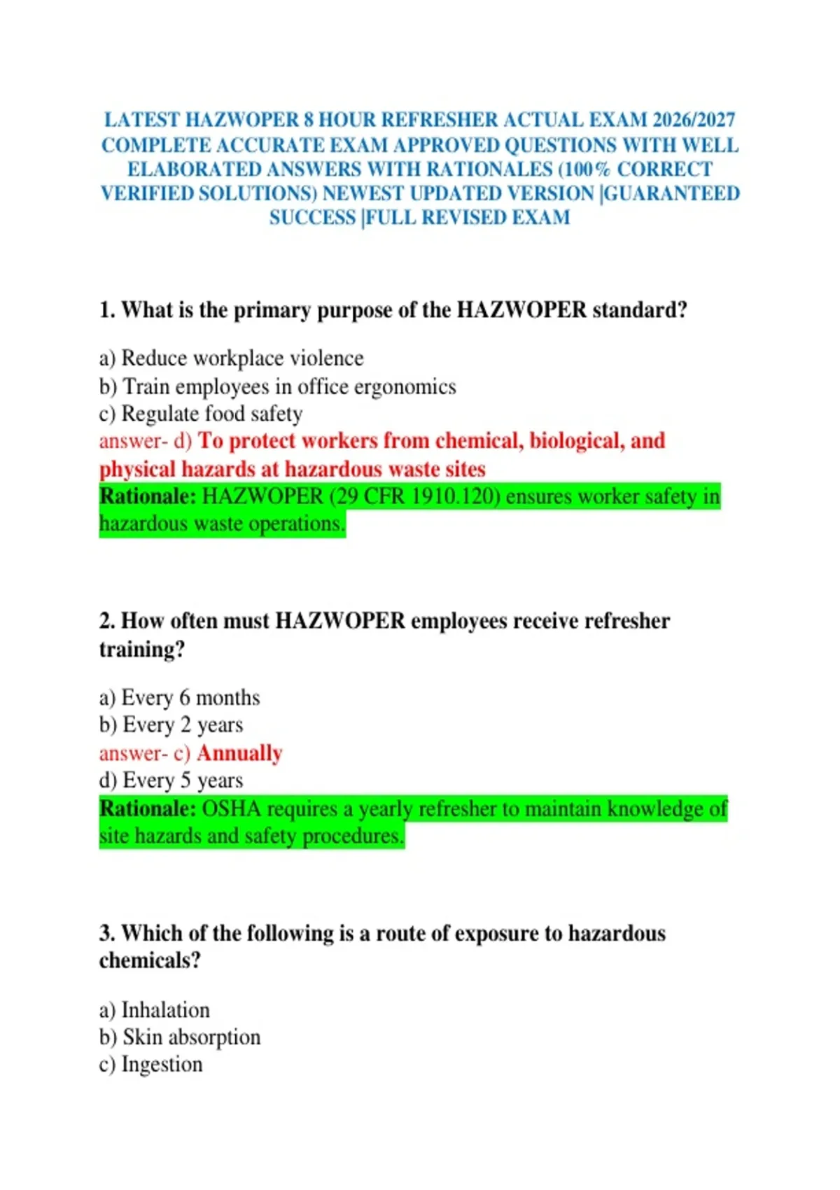 Rationale: OSHA requires a yearly refresher to maintain knowledge of