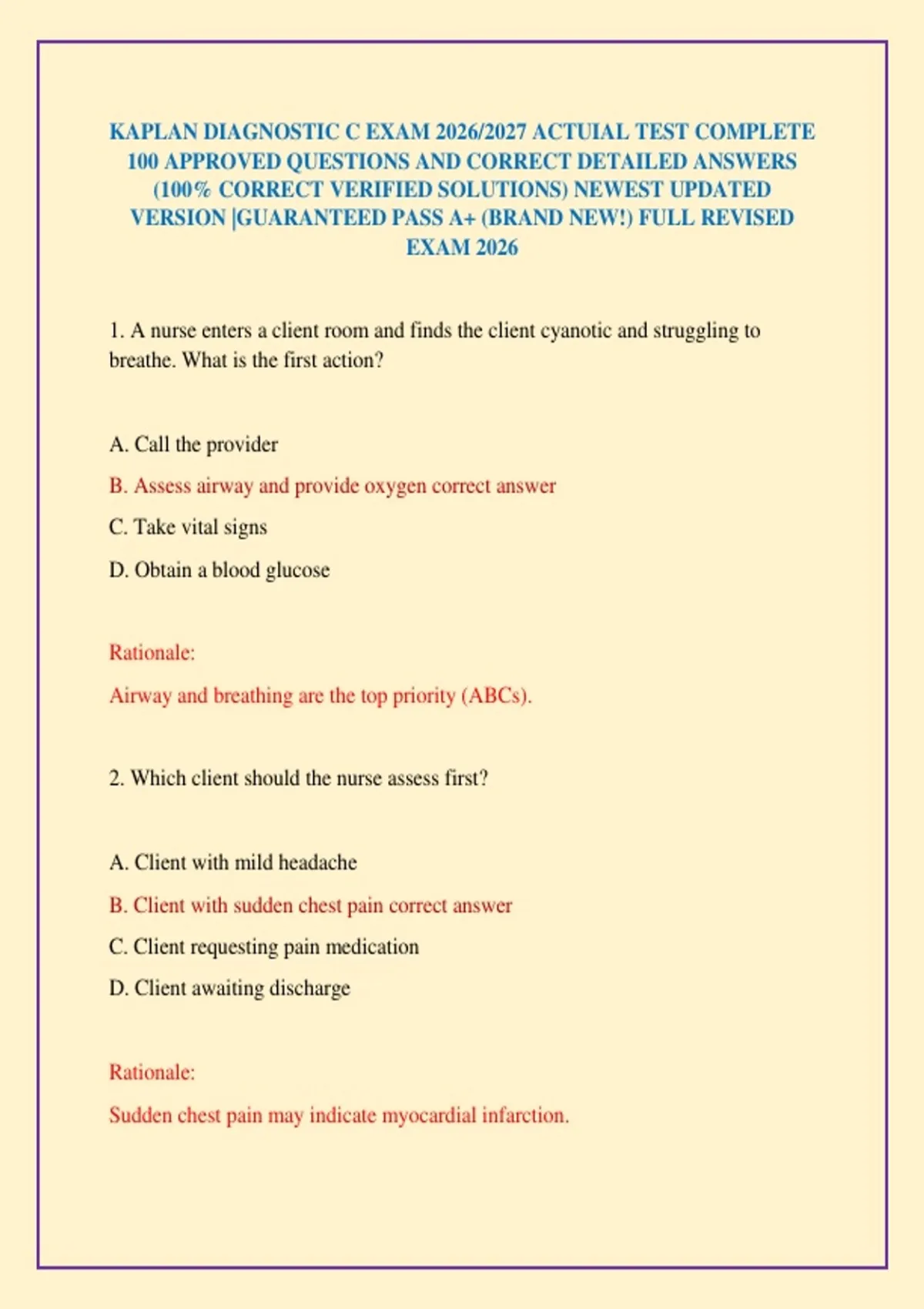 1. A nurse enters a client room and finds the client cyanotic and struggling to